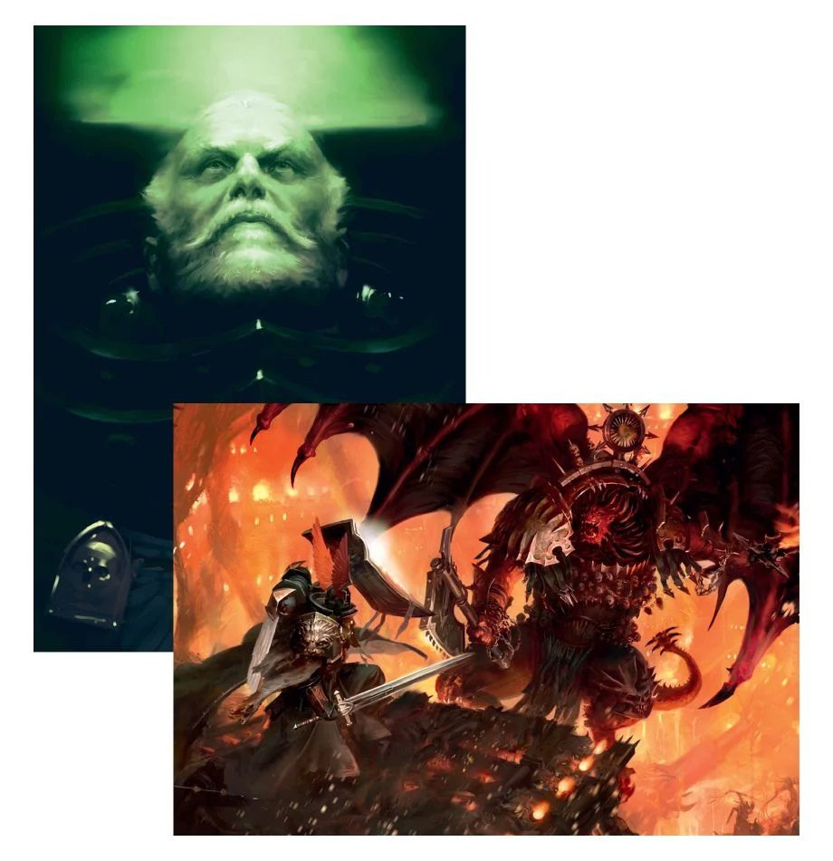 Along with the miniatures, this set also includes two pieces of artwork – a portrait of the Lion, and an action scene of him fighting his brother, the Daemon Primarch Angron.