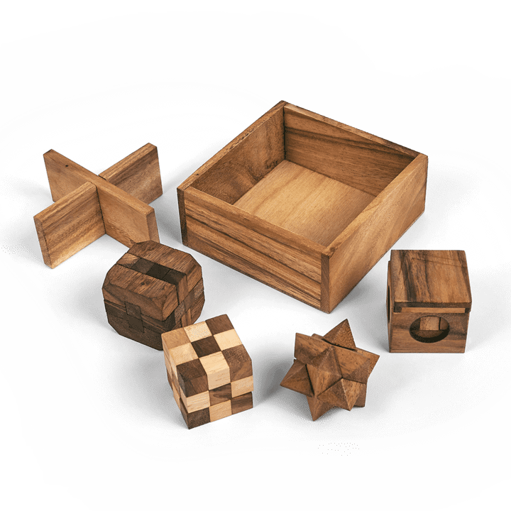 This set of 5 quality hardwood puzzles includes the Snake Cube, the Soma Cube, the Star Puzzle, the Diamond Cube and one tricky box. All fit nicely in a great timber box.
