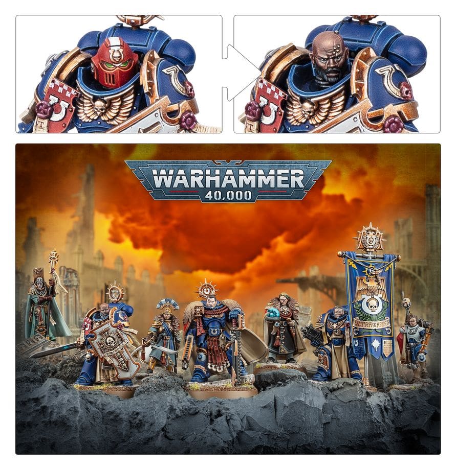 This multipart plastic kit builds 7 highly detailed miniatures for your Space Marine armies in Warhammer 40,000, featuring Captain Titus, his closest advisors, and veteran battle-brothers. Captain Titus appears in the finery of his newly reclaimed position, while Ancient Gadriel carries the company standard, and Veteran Sergeant Metaurus is equipped as a Bladeguard Veteran. The accompanying characters—Commodore Gaius Silva, Astropath Dainal Kornelius, Legatus Aemelia Minervas, and Plenipotentiary Lucia Vestha—bring both narrative depth and painting opportunities to your army.