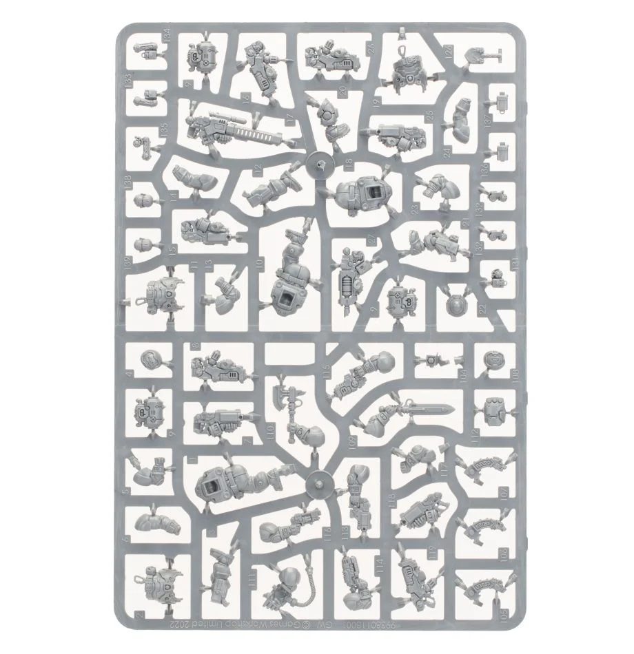The kit offers loads of cosmetic options, so no two squads need look the same – you’ll find both helmeted and bare heads, Ironkin heads, extra arms holding a variety of weapons and grenades, loads of pouches and tools, and three different cosmetic crests for the Theyn.