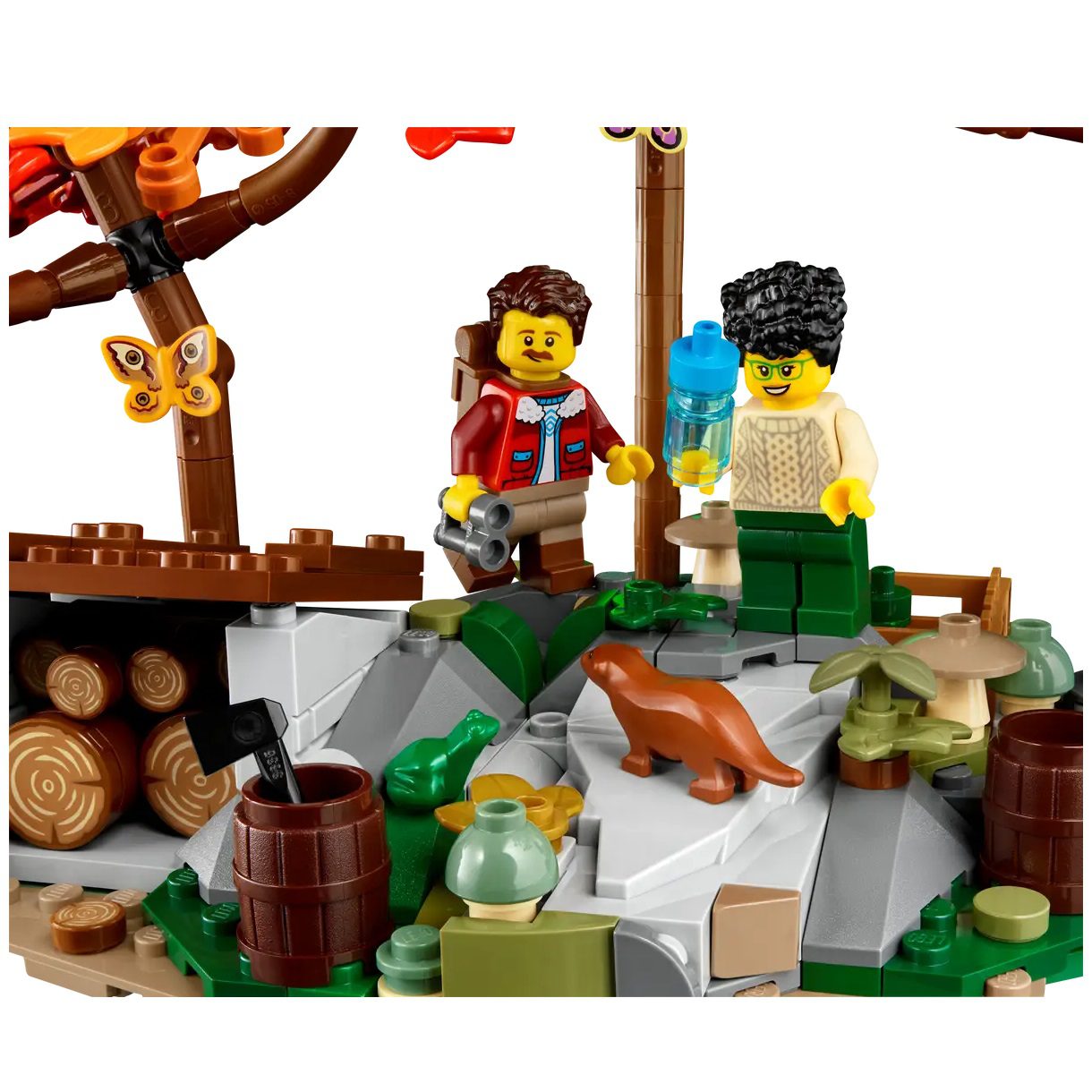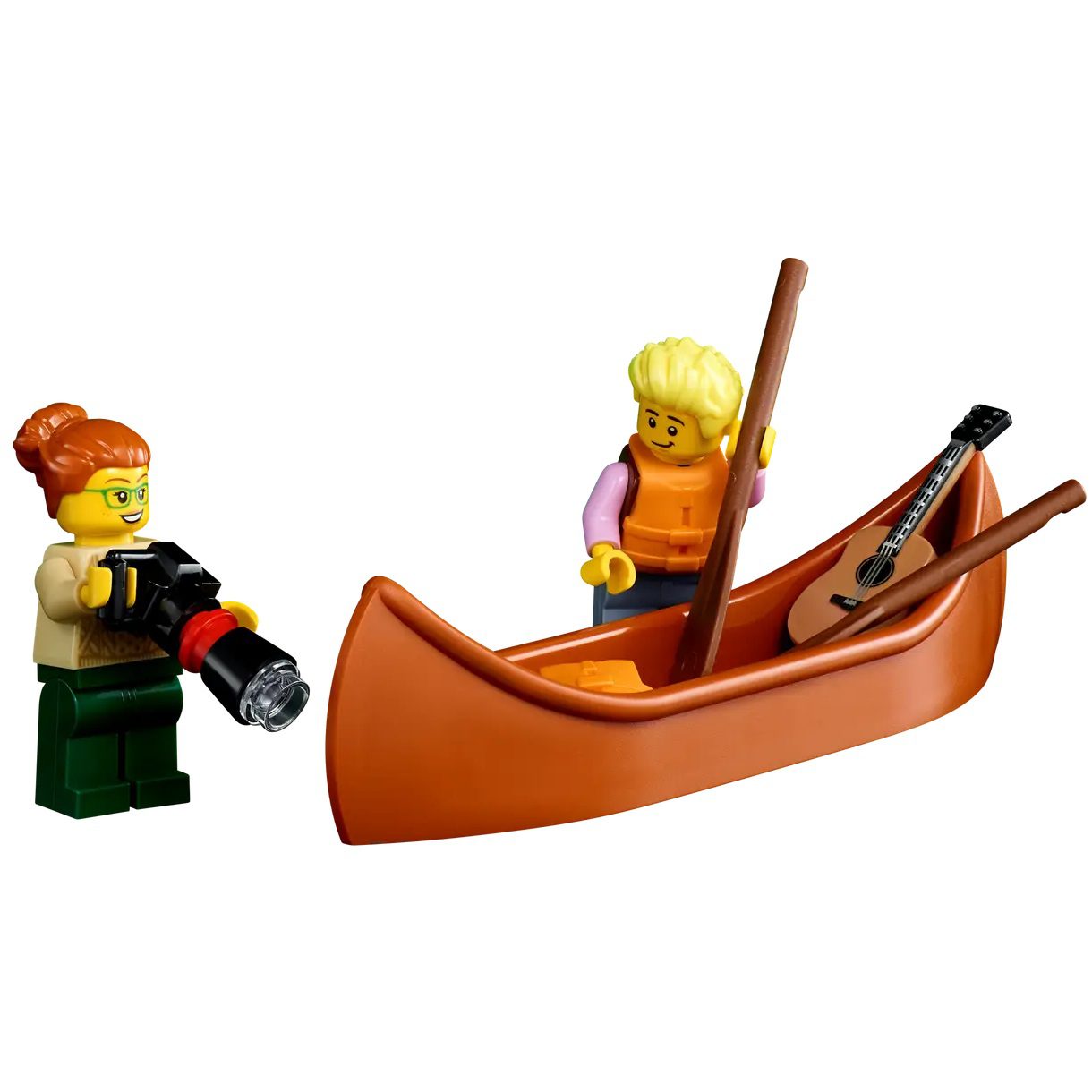 - 3 buildable trees and a canoe – Place the trees separately around the cabin or connect them to create a small island that the minifigures can reach using the canoe