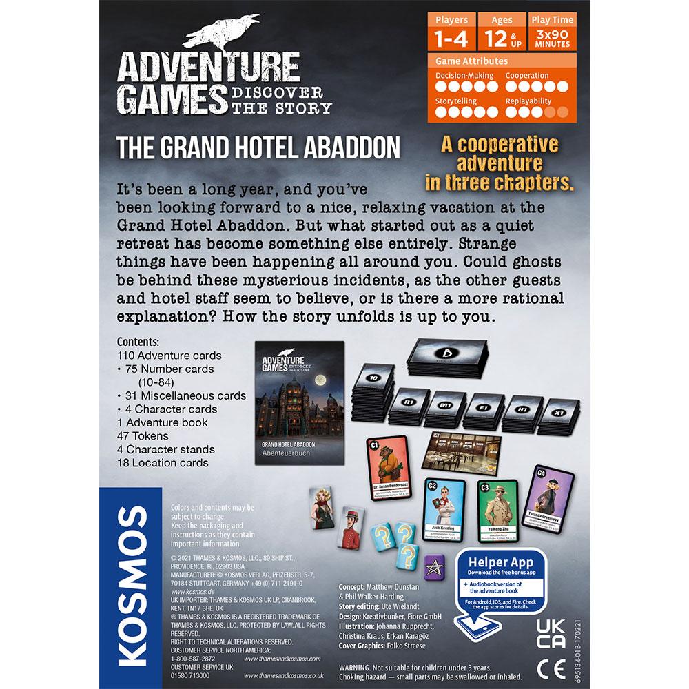 The Grand Hotel Abaddon is a cooperative adventure game, played over three chapters. During the game, the choices you make determine what happens next. Explore the hotel, question guests, investigate rooms, and wander hidden passageways. Each player takes on a different role, cooperating to uncover hidden secrets. Only by working together will you be able to solve the mystery of the Grand Hotel Abaddon. With multiple possible endings, your choices will decide how the story ends!