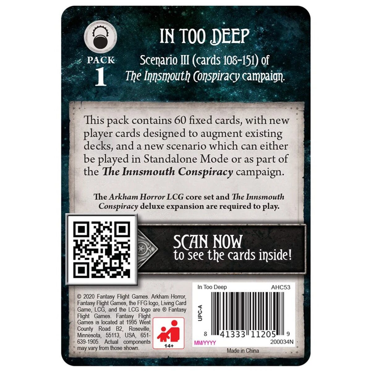 Within In Too Deep, the first Mythos Pack in The Innsmouth Conspiracy cycle for Arkham Horror: The Card Game, you’ll find the next chapter of the story, drawing you deeper into the tangled web surrounding your visit to Innsmouth. It’s not just a new scenario, however—you’ll find new player cards to support every class, including powerful new Covenants that center on the bless and curse tokens introduced in The Innsmouth Conspiracy deluxe expansion.