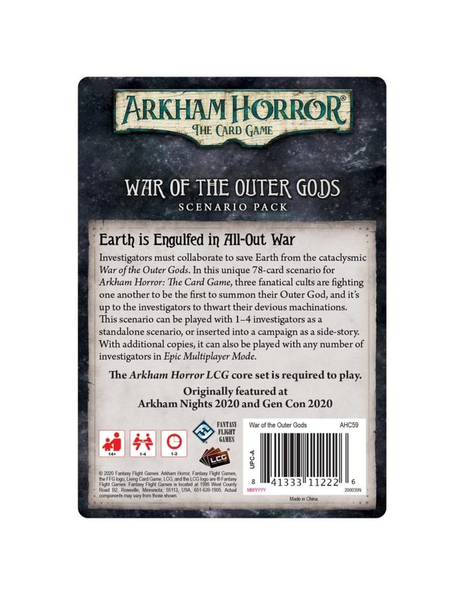 In War of the Outer Gods, a new scenario pack for Arkham Horror: The Card Game, Arkham is caught in the midst of a world-shattering conflict between three rival cults, raging across all of North America. Each of these cults seeks to summon its own Ancient One—and as they battle each other across the continent, every enemy slain brings one of these dark gods closer to awakening. Can you and your fellow investigators survive being caught in the middle of this war, or will our world be torn asunder?