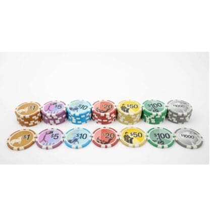 Clay 13.5 poker chip set with Australian currency inspired designs.