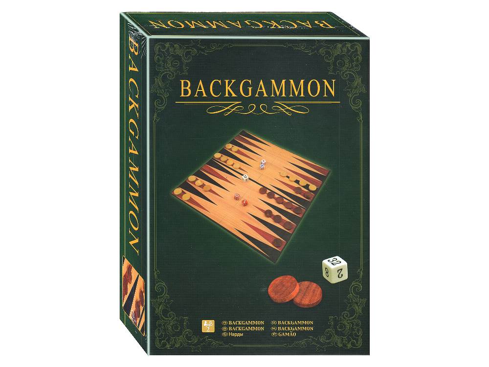 Backgammon set with thirty light and dark wooden pieces, and a 36.5cm folding board. By Gameland.
