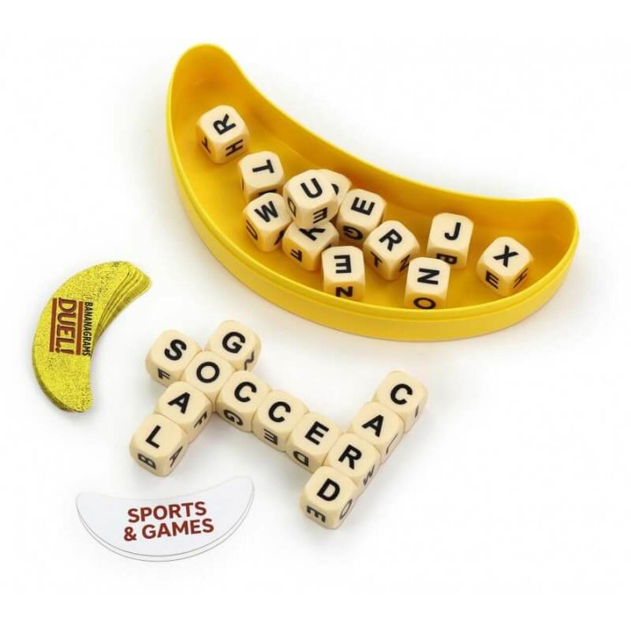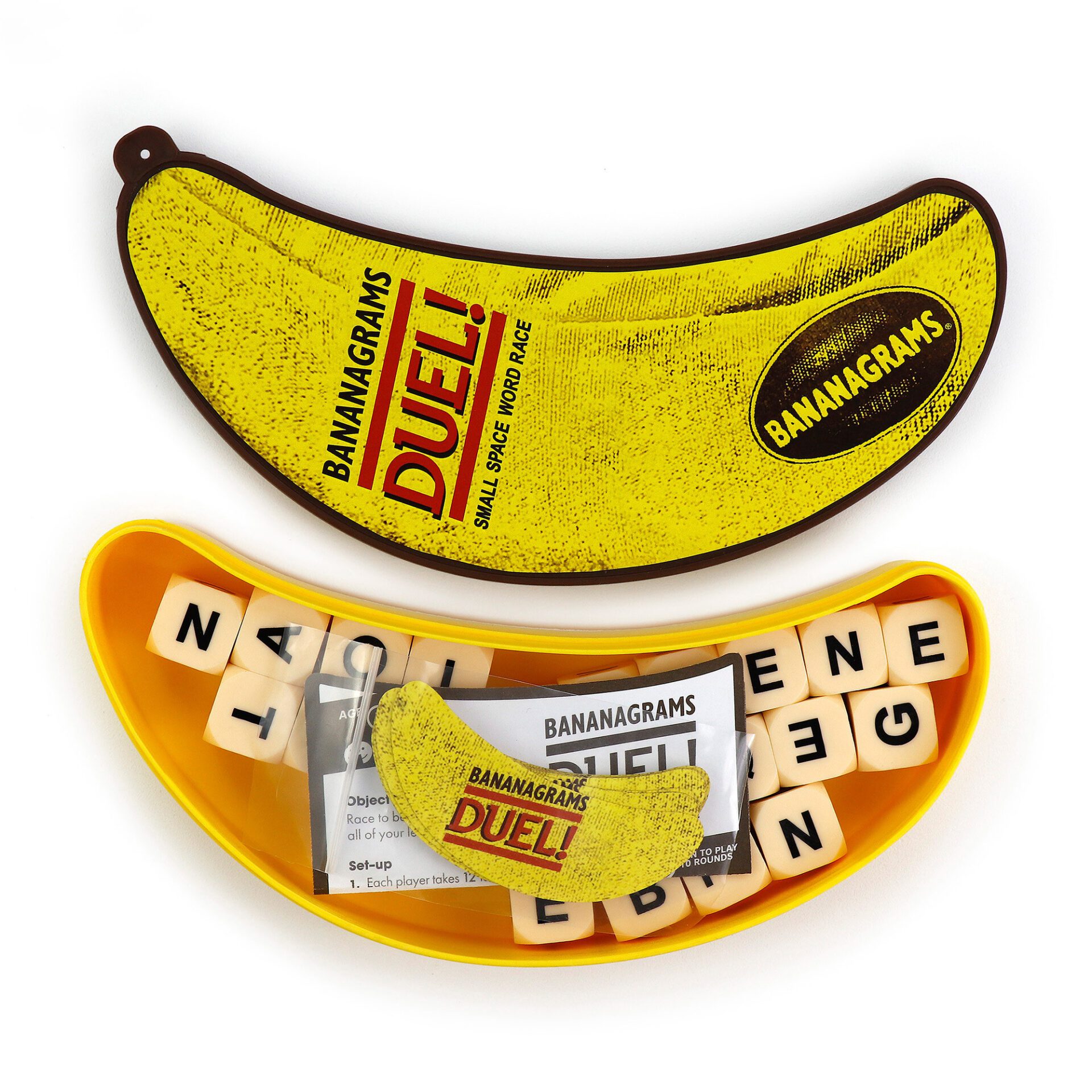 Duel is a head-to-head BANANAGRAMS snack for cozy spaces and on-the-go play! It’s a two-player word game face-off, where players race to build their own word grid using letter cubes. BANANAGRAMS Duel includes fun banana-shaped theme cards for an added challenge during every round of play! The (24) dice feature all (144) letters from the classic game crafted into a perfect BANANAGRAMS experience for two!
