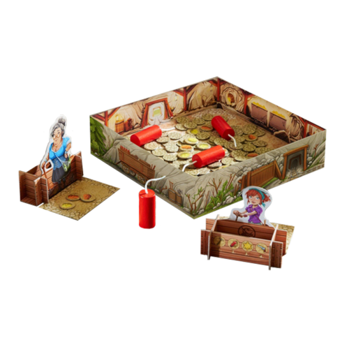 Not for the faint hearted, Boom, Bang, Gold is an exciting game with plenty of action in which speed and a good eye are important. The person who manages to collect the most nuggets in their gold chest at the end of the day wins the fast-paced treasure hunt. On the command ‘Boom, Bang, Gold’ everyone throws their dynamite sticks into the gold mine at the same time, then using only one hand, they all search for gold nuggets and action tiles from the mine to place on their personal shelf. If you spot a special tile with bat, rat, snake, or ghost, call ‘Watch out!”‘ to warn the other players there is danger before continuing play. When no more face-up tiles remain, the wild scramble is over and the action tiles are played. Use the game variations for hilarious consequences and after 12 rounds, whoever has the most gold wins!
