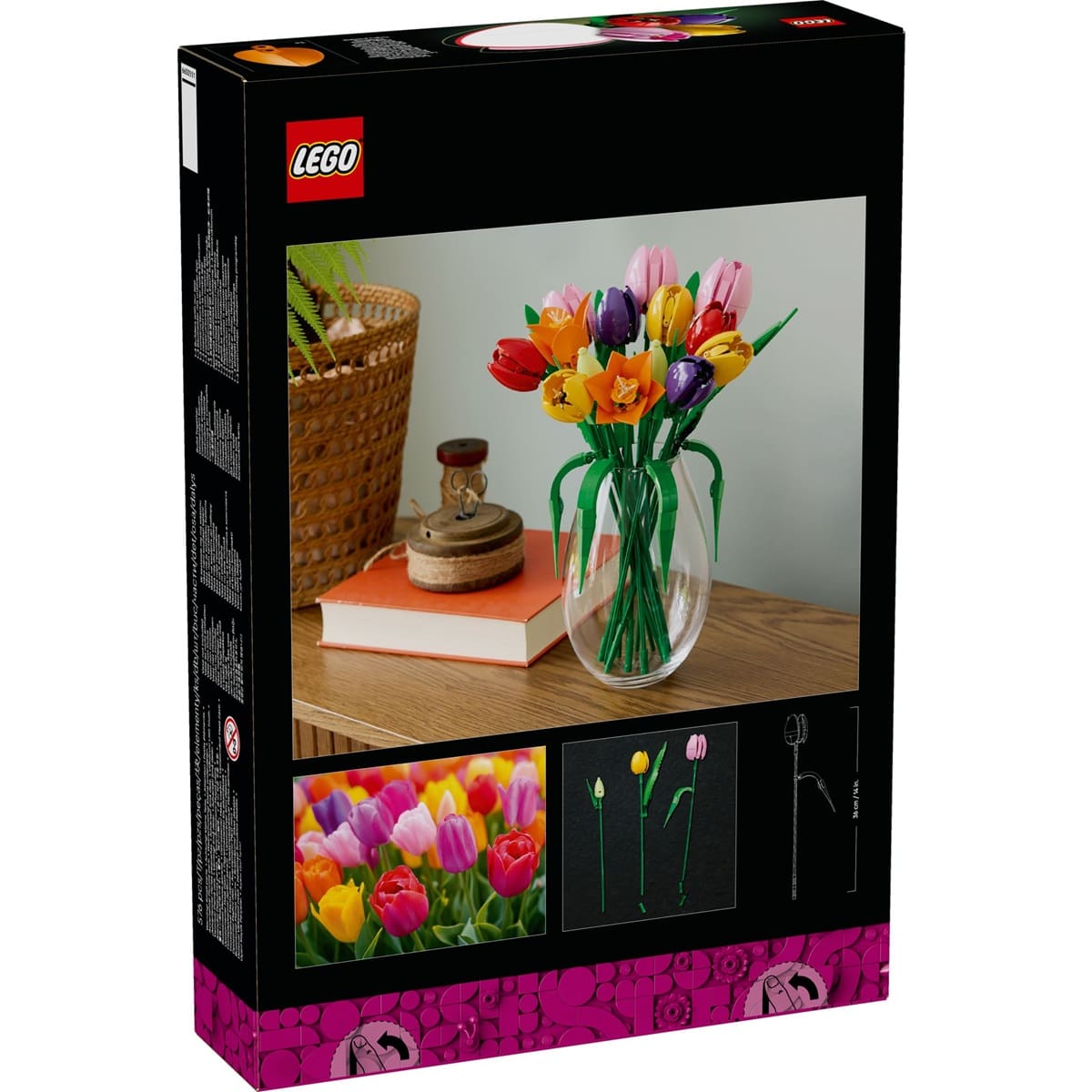 This Tulip Bouquet is part of the LEGO® Botanicals range, offering the option to mix and match with other flower sets like roses to create an even more vibrant display. The tallest tulip stands over 36 cm high, making it an elegant and eye-catching centerpiece for your home.