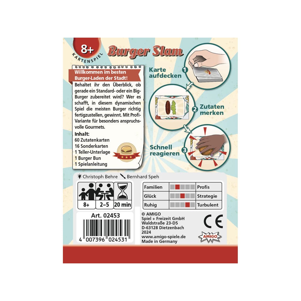 Burger Slam serves up fast, frantic fun as players compete to build the most accurate burgers in a bustling shared kitchen. Designed for 2 to 5 players aged 8 and up, this quick 20-minute card game blends sharp memory with cheeky bluffing as you race to assemble Standard and Big Burgers using just four types of toppings.