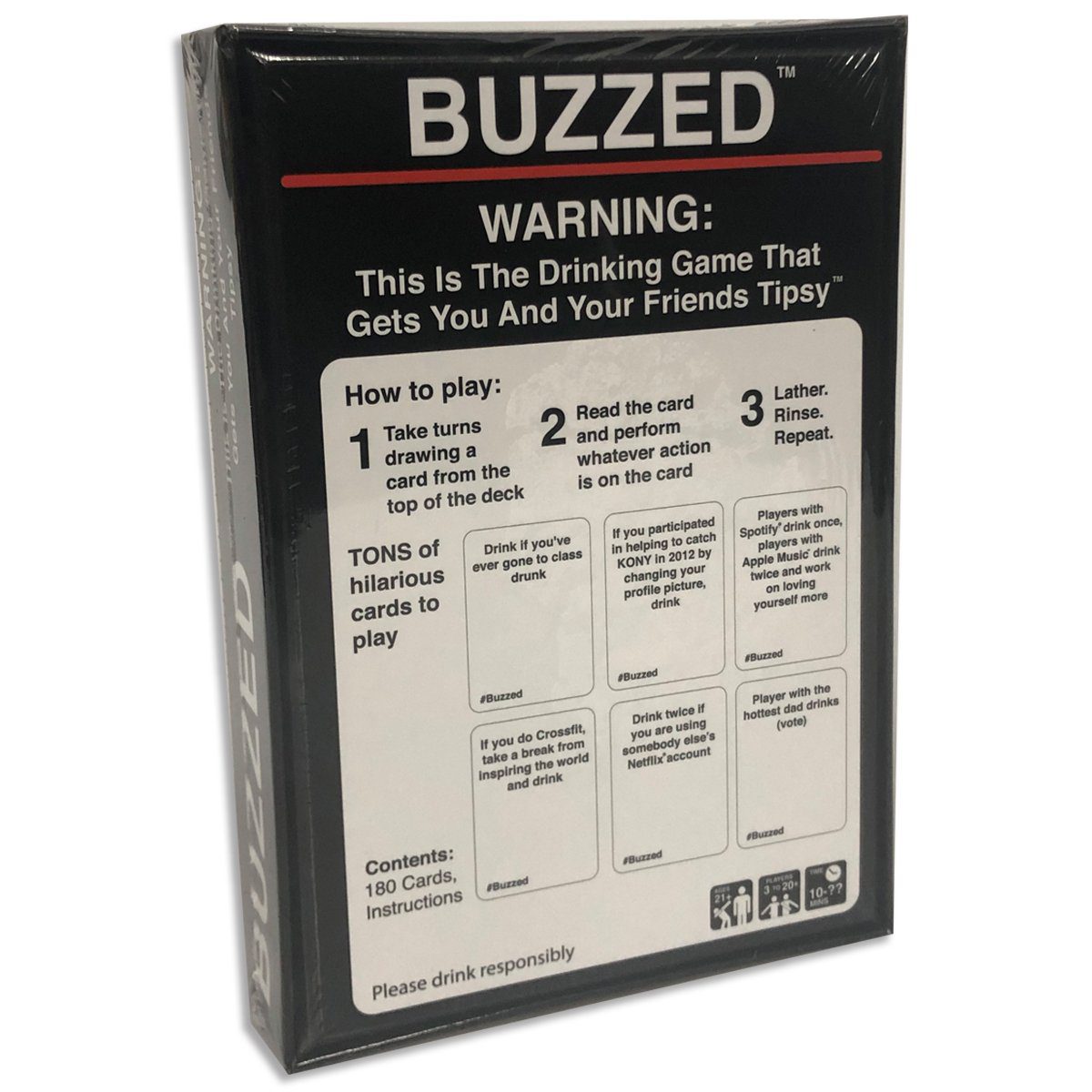 It’s simple — take turns drawing a card from the top of the deck. When it’s your turn, read the card out loud and either you or the group will drink based on the prompt on the card, depending on what it is. Lather, rinse, repeat. Designed for 3 to up to 20 players.