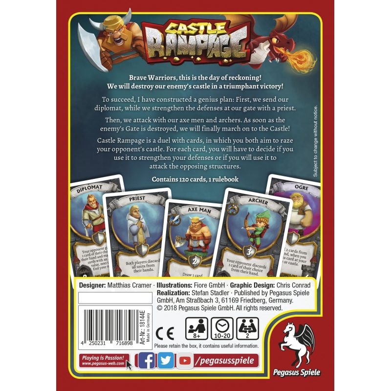 Castle Rampage is a quick and entertaining tower defense card game in which both players are the attacker as well as the defender. Each turn, they have to consider which part of their castle to reinforce and how many cards to play in order to tear down the opponent’s castle walls as quickly as possible.