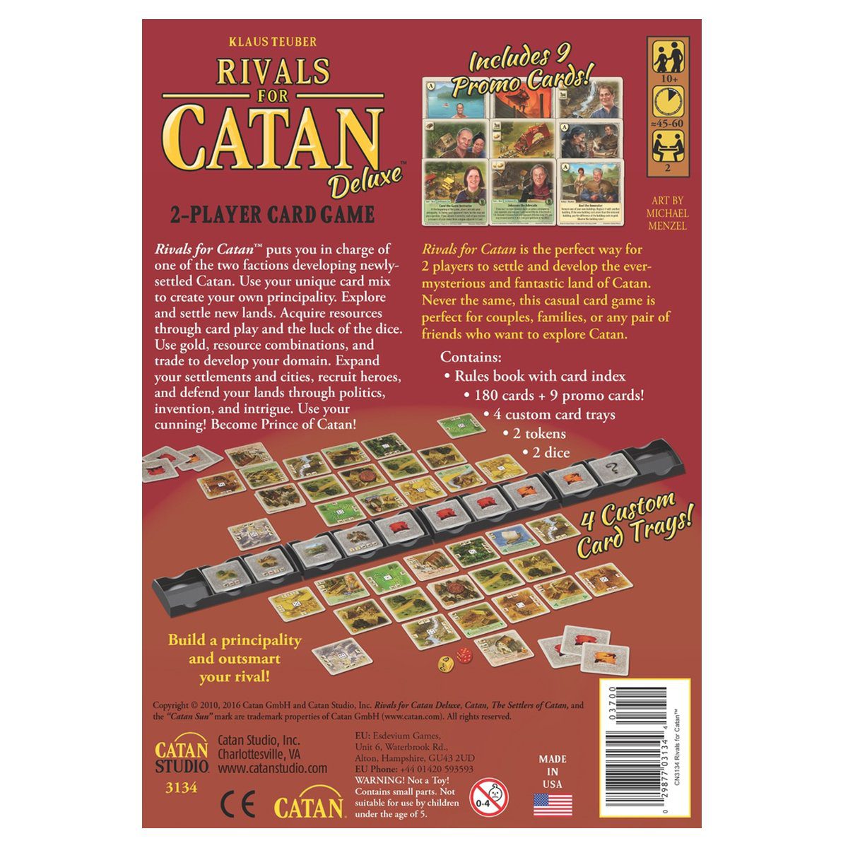 Rivals for Catan: Deluxe puts you in charge of one of the two factions developing newly-settled Catan. Use your unique card mix to create your own principality. Explore and settle new lands. Acquire resources through card play and the luck of the dice. Use gold, resource combinations, and trade to develop your domain. Expand your settlements and cities, recruit heroes, and defend your lands through politics, invention, and intrigue. Use your cunning! Become prince of Catan!