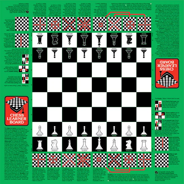 Master the art of chess with this amazingly resilient board, printed with all legal moves and fold it away quickly for easy storage. The perfect way to learn and teach chess is with the Chess Learner Board.
