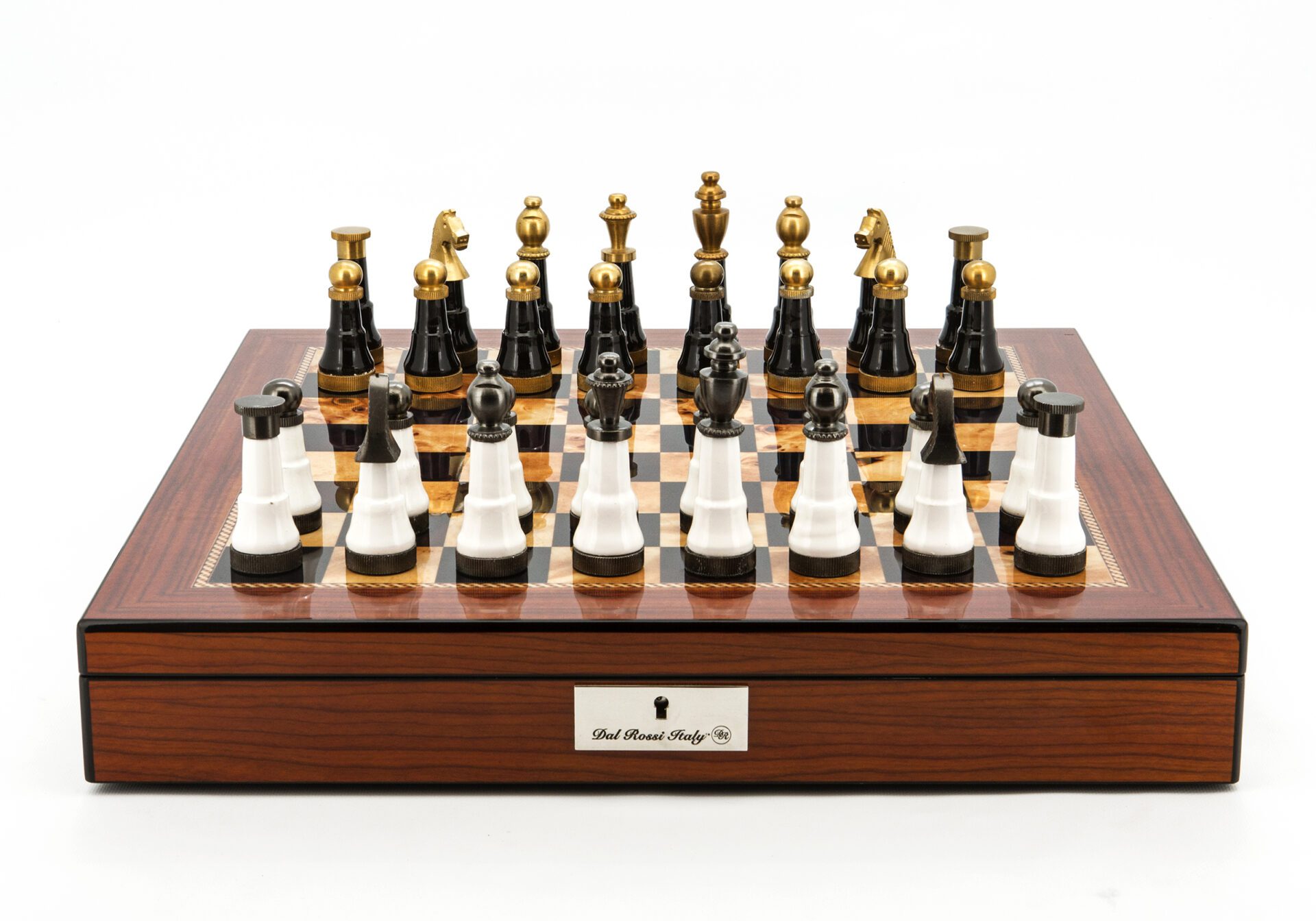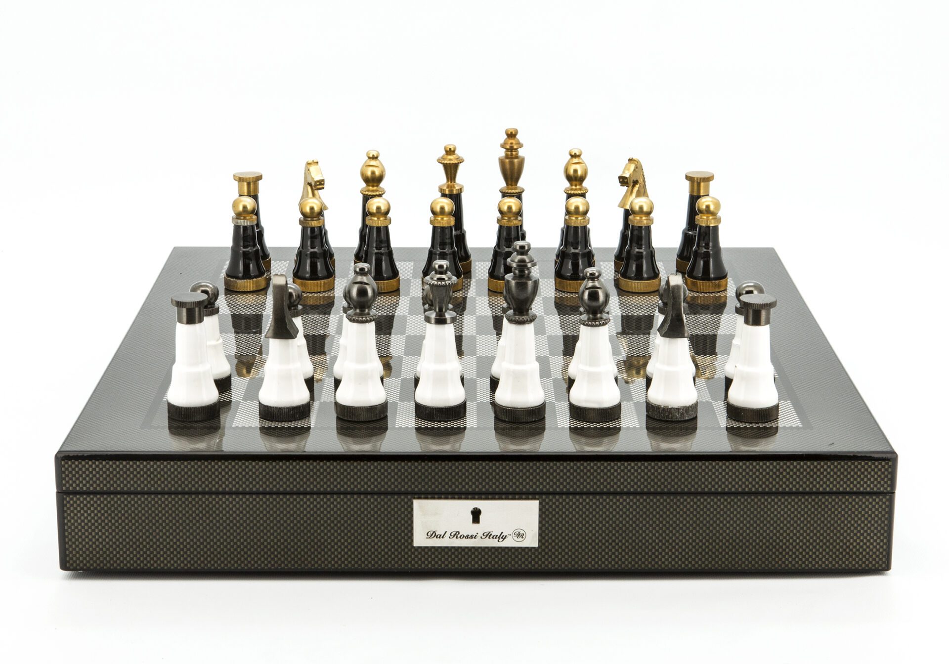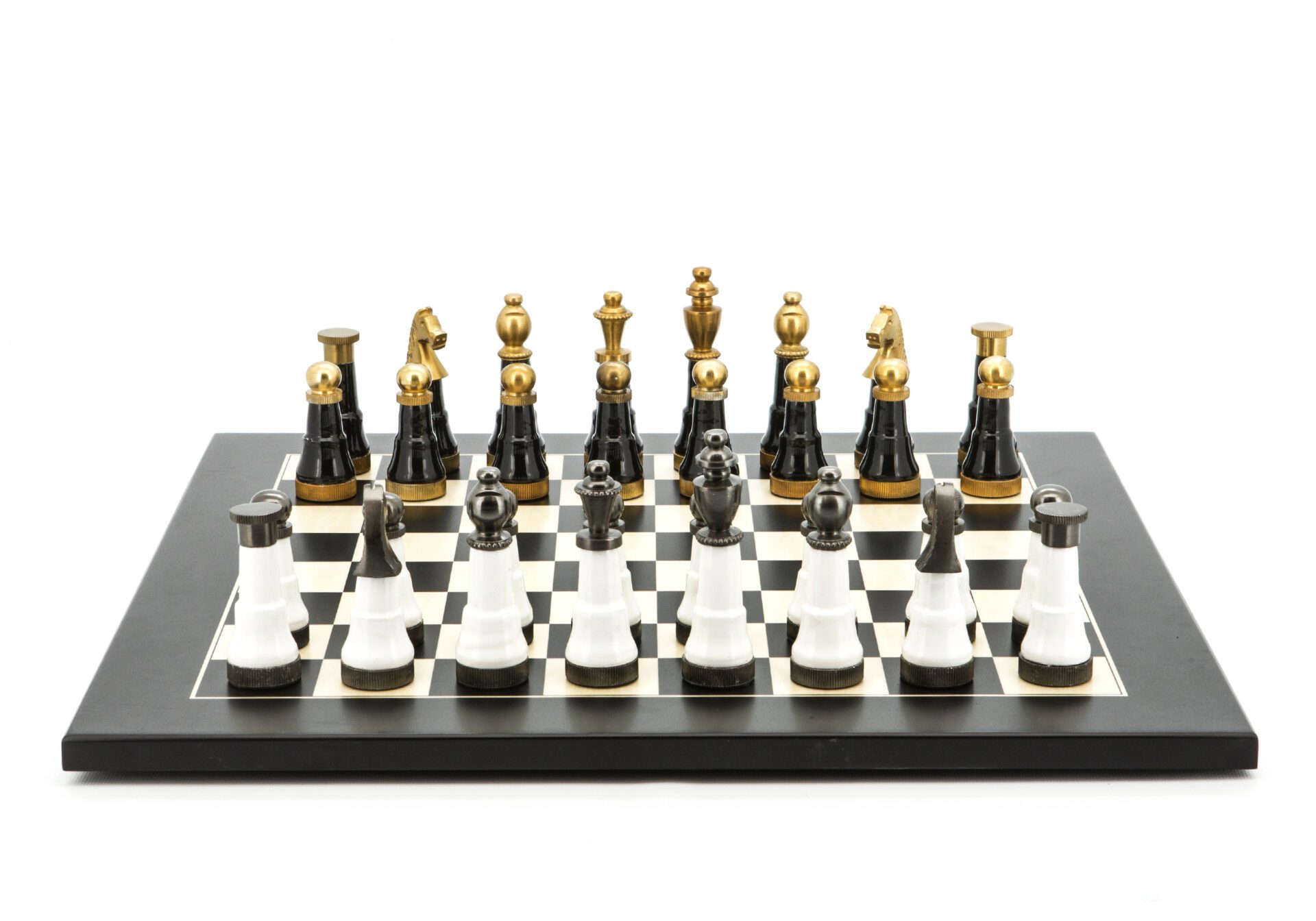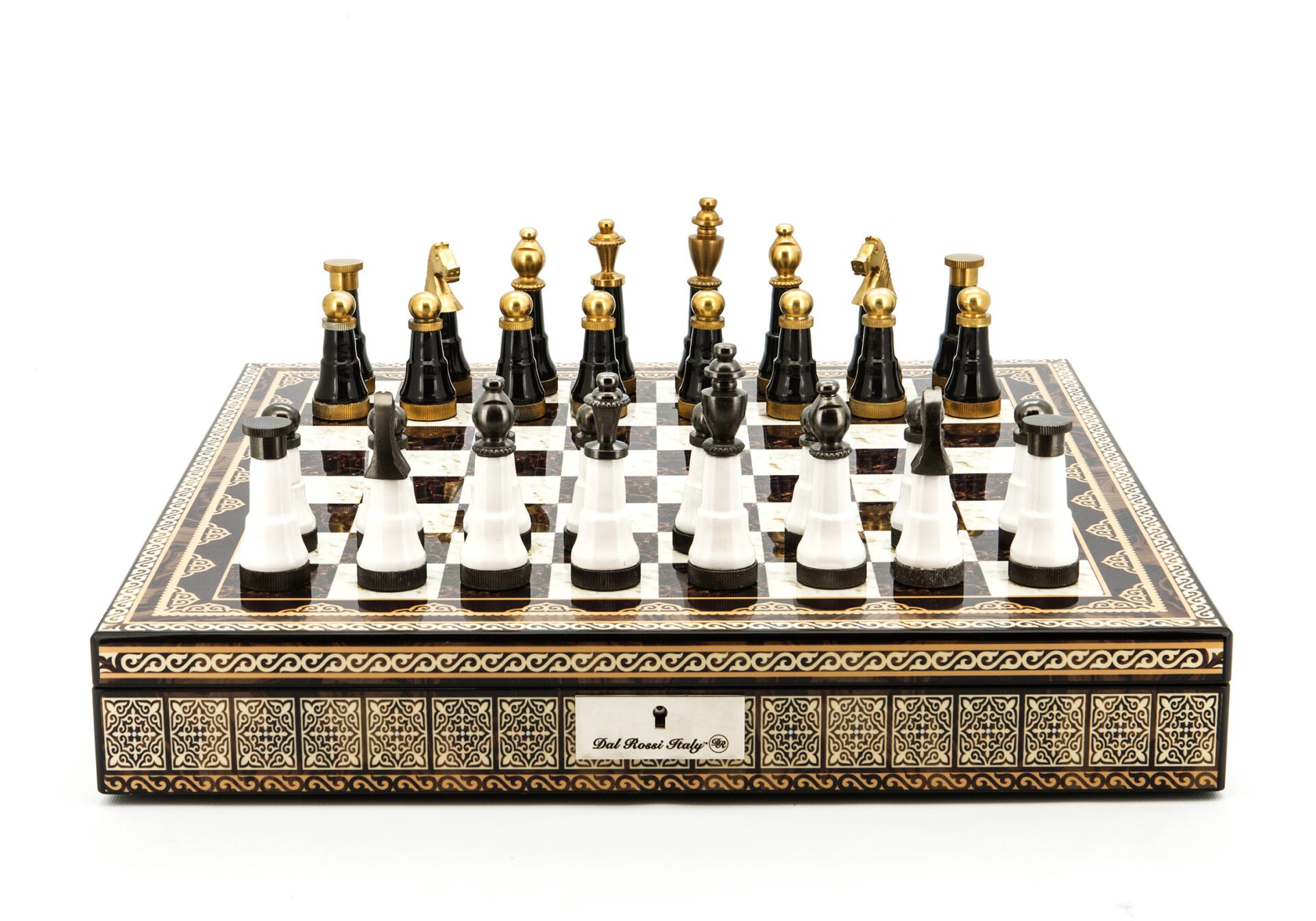 Dal Rossi Italy Chess men in Black and White with Gold and Gun Metal Tops and Bottoms. King height approx 110mm