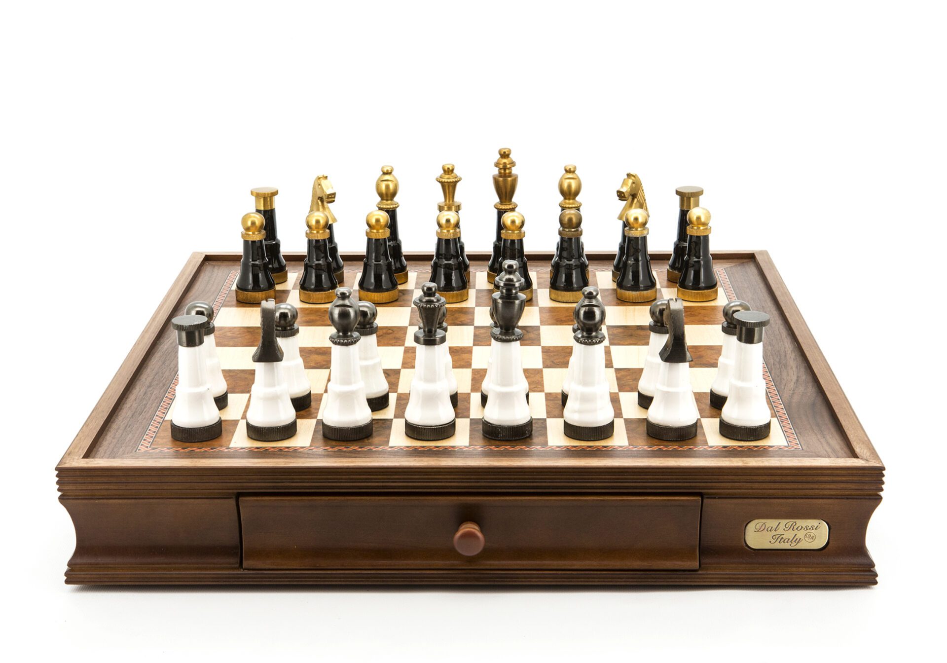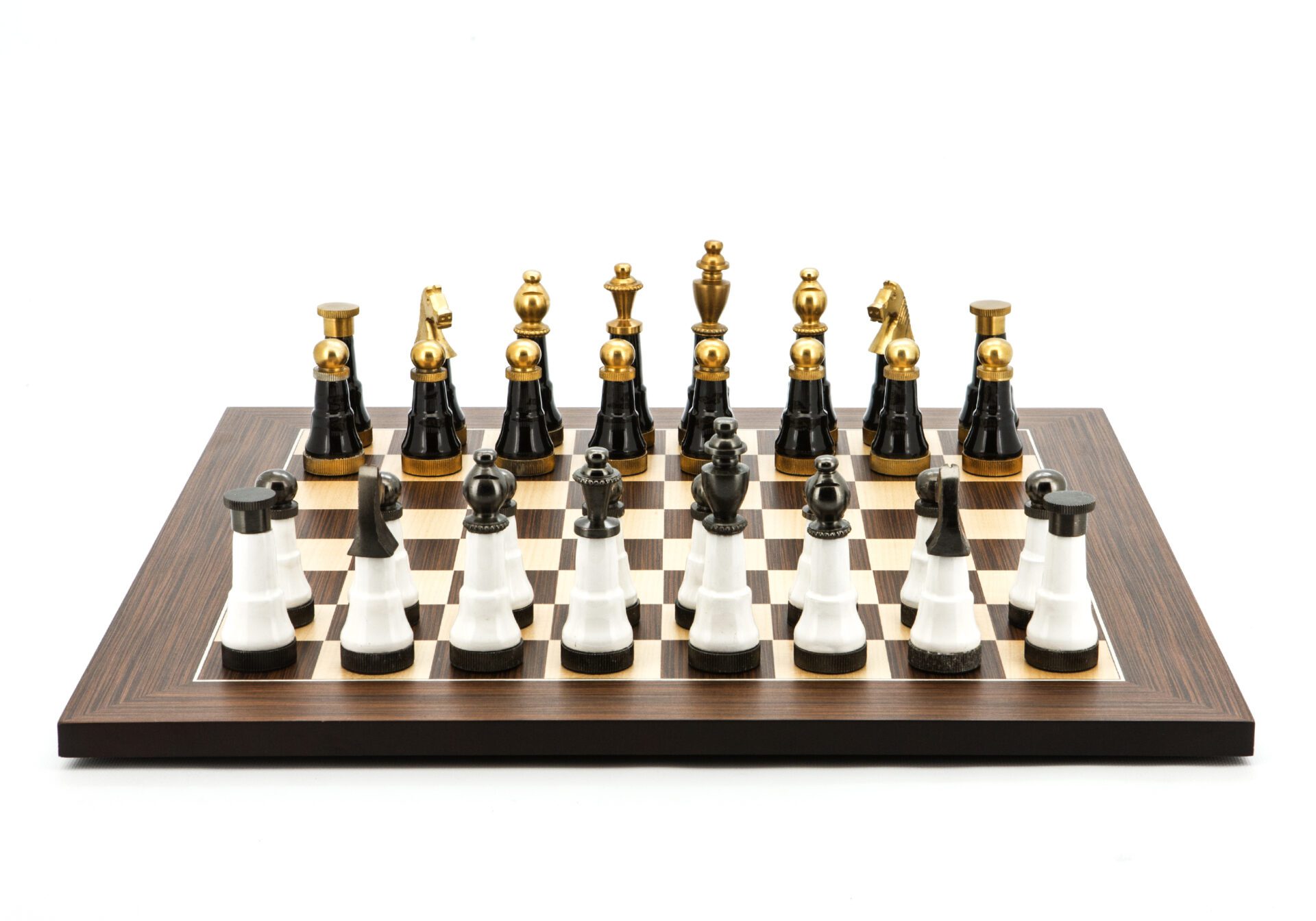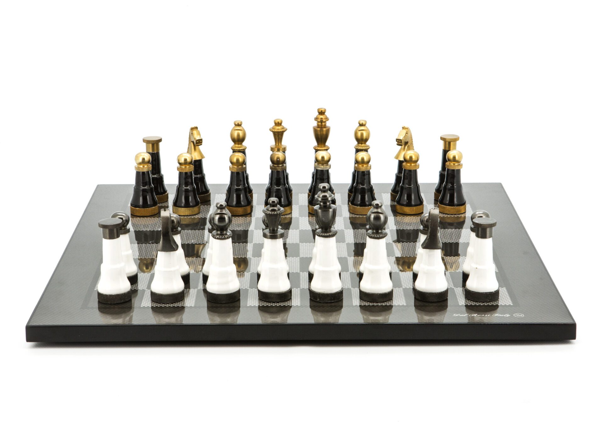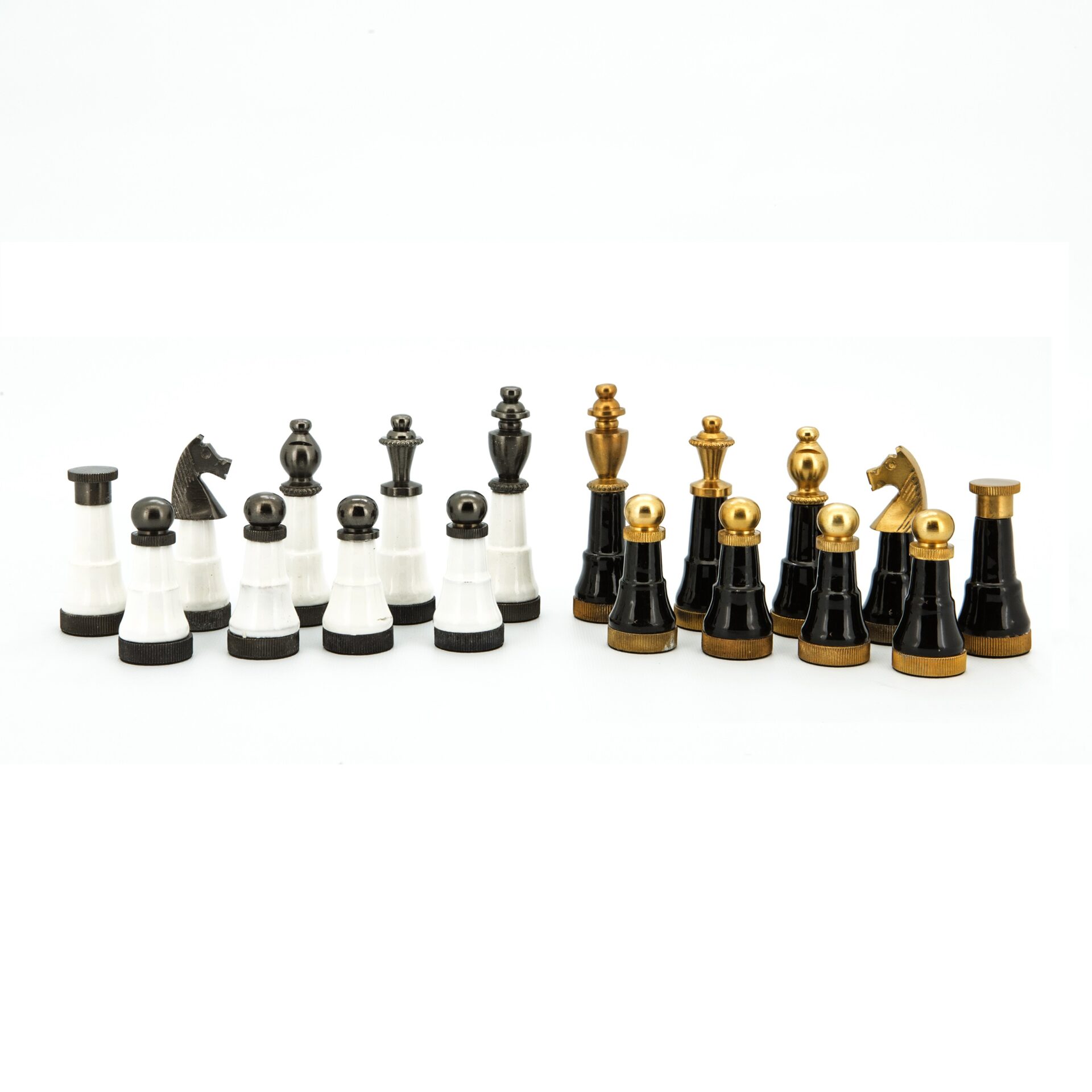 Dal Rossi Italy Chess men in Black and White with Gold and Gun Metal Tops and Bottoms. King height approx 110mm