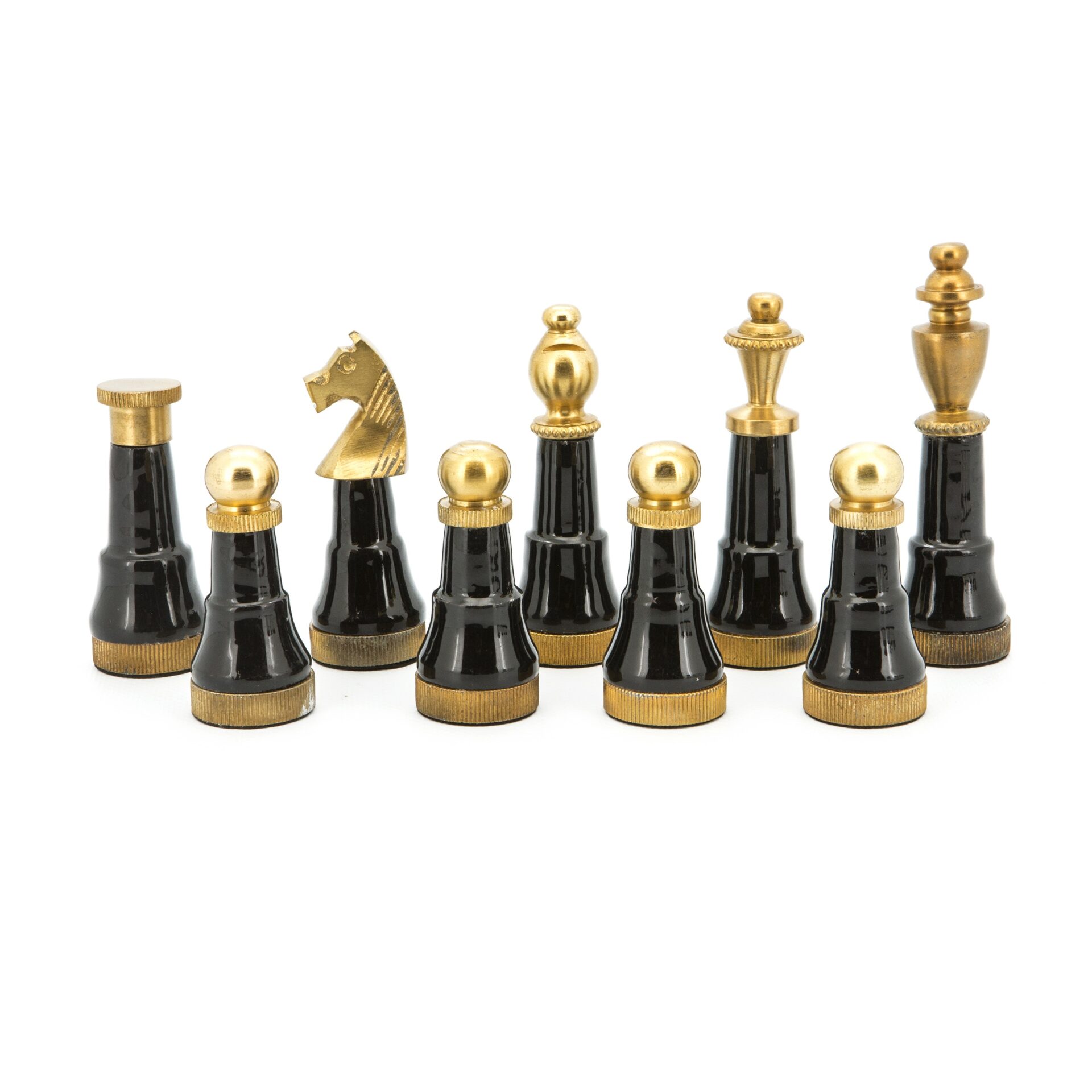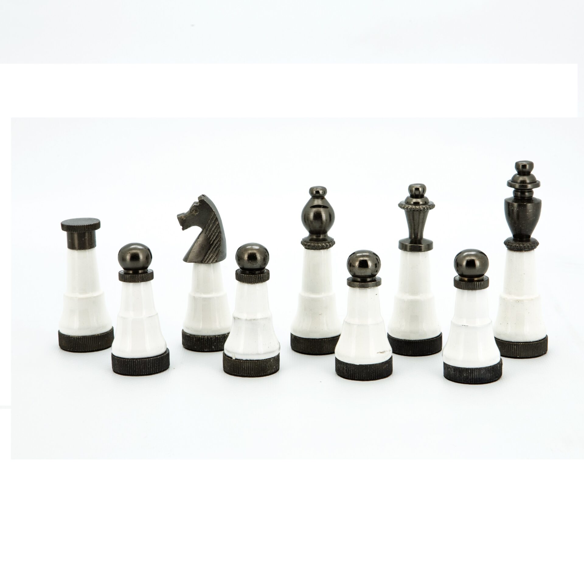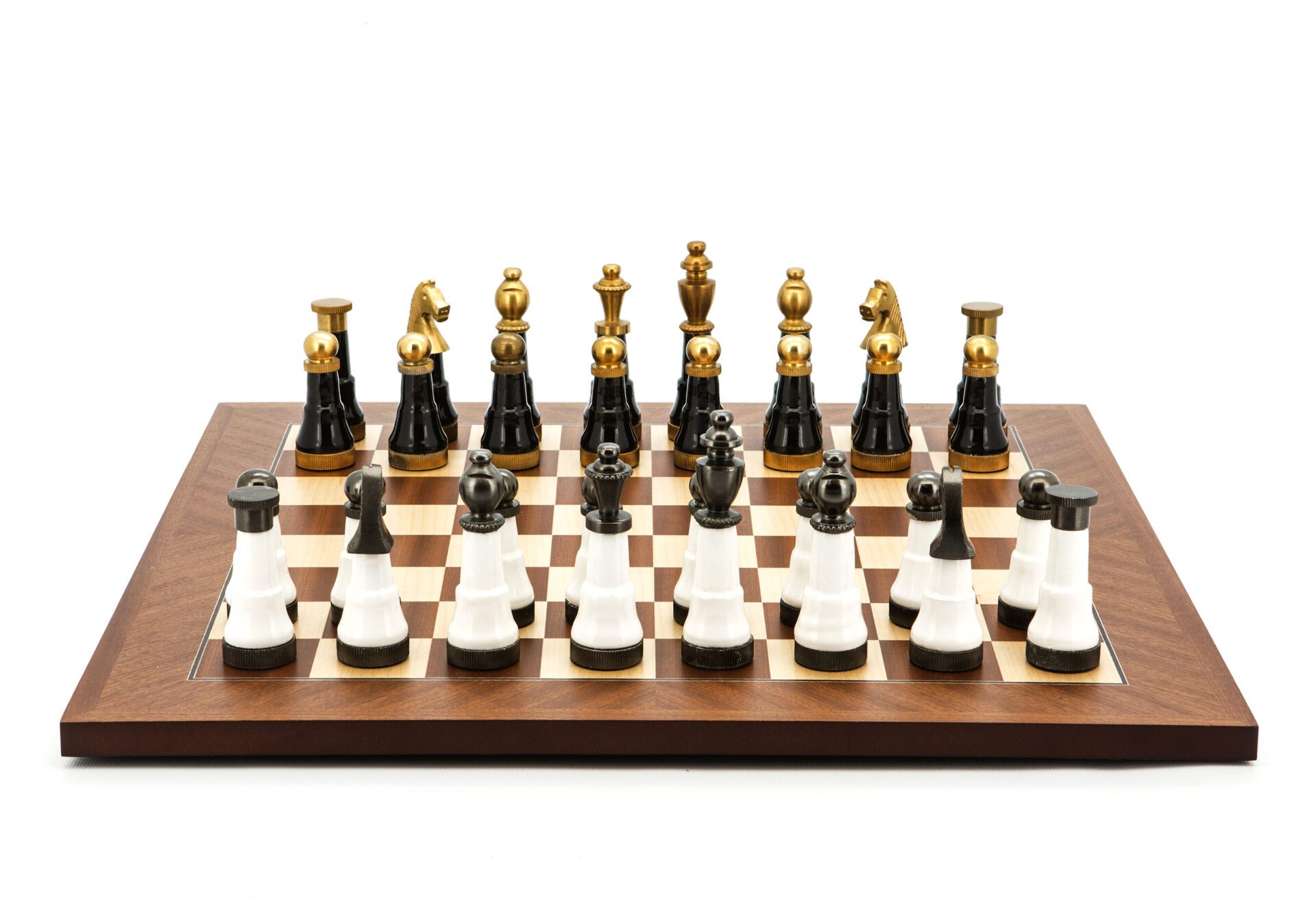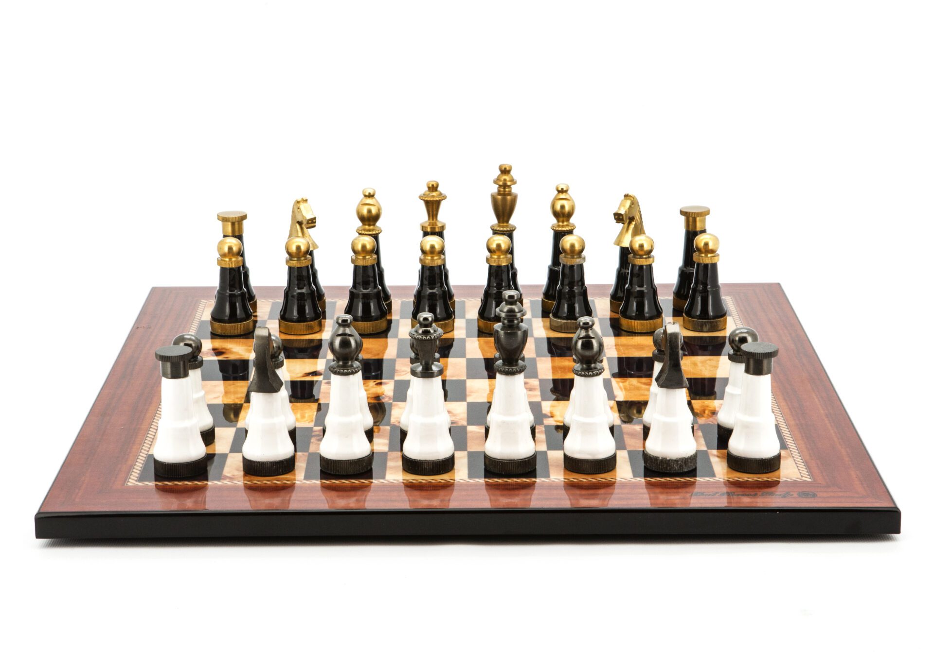 Dal Rossi Italy Chess men in Black and White with Gold and Gun Metal Tops and Bottoms. King height approx 110mm