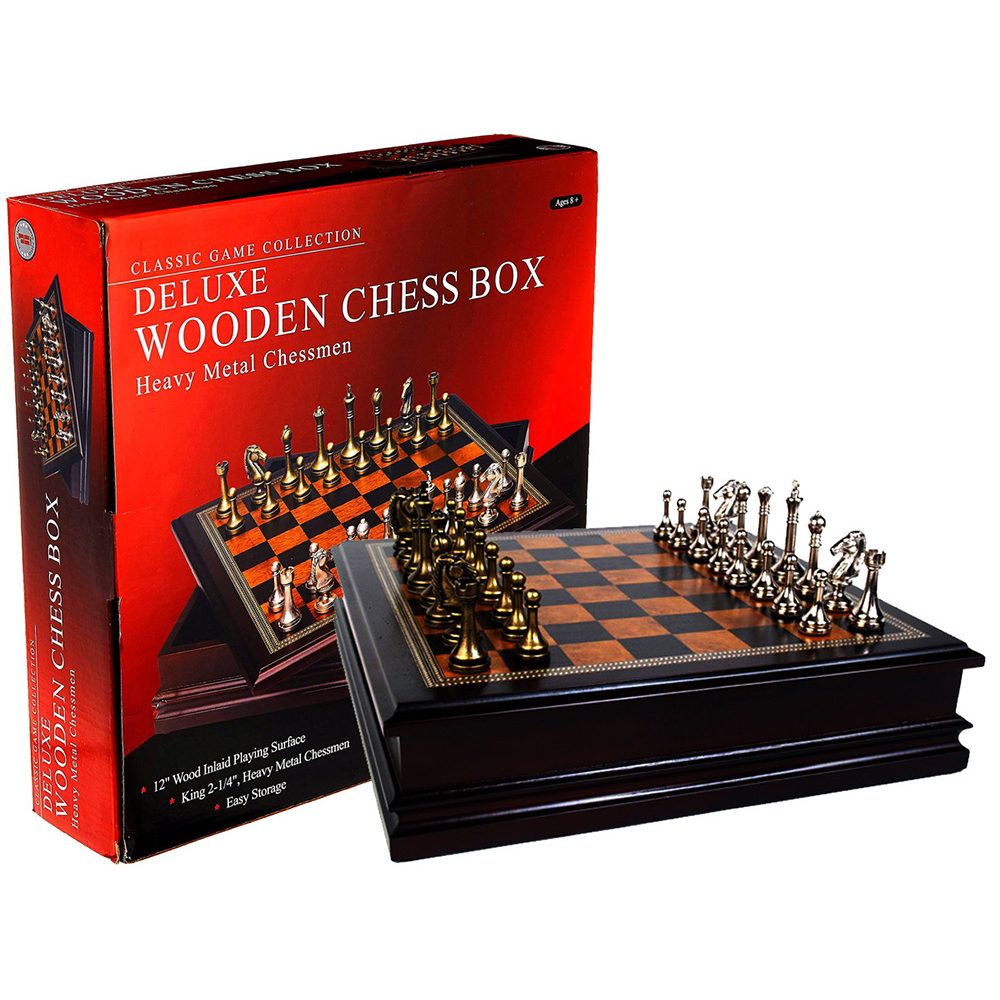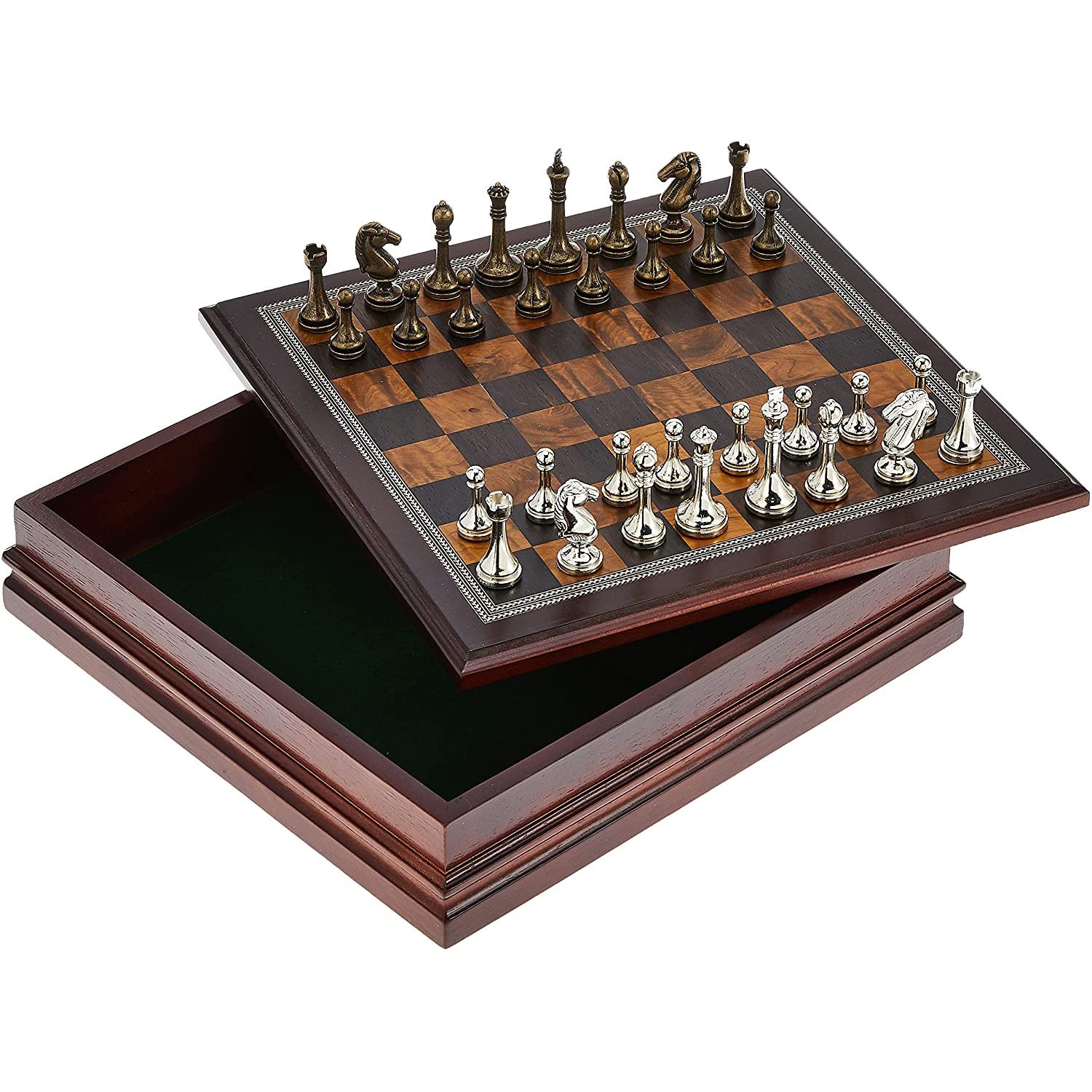 Metal Staunton Chess Set w/ Wooden Board. WorldWise Imports has created a unique line of gaming products. With their extensive knowledge of the gaming industry they have brought in products that make an excellent addition to any home or family game collection. Metal Staunton Chessmen with Wood Inlaid Chest – 2 velour pull-string pouches for men.