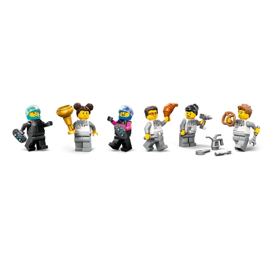 • What’s in the box? – Includes a toy car garage with workbenches, tool and welding carts, a tower of slick tyres and 2 F1® race cars, plus a winner’s trophy and 2 driver and 4 mechanic minifigures