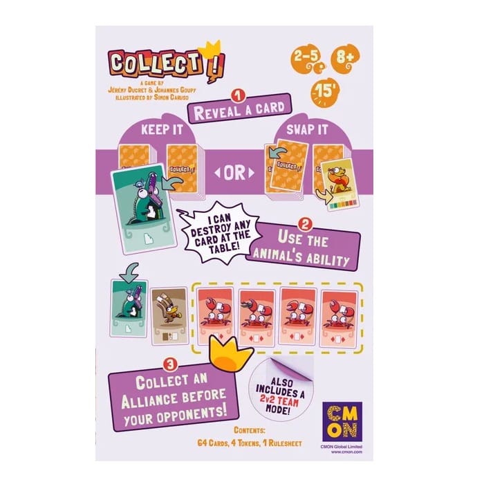 The Animal Kingdom is searching for its next ruler — and only the most charismatic leader will win the crown! In Collect!, players compete to earn the loyalty of different animal factions by strategically playing cards and forming alliances.