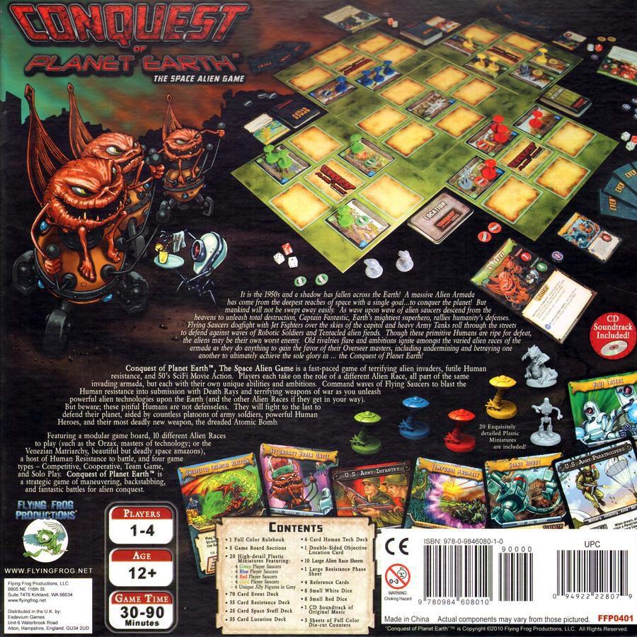 Featuring a modular game board, 10 different alien races to play (such as the Orzax, master of technology, or the Venezian Matriarchy, beautiful but deadly space amazons) a host of Human resistance to battle, and four game types – competitive, cooperative, team game, and Solo Play. Conquest of Planet Earth is a strategic game of maneuvering, backstabbing, and fantastic battles for alien conquest.