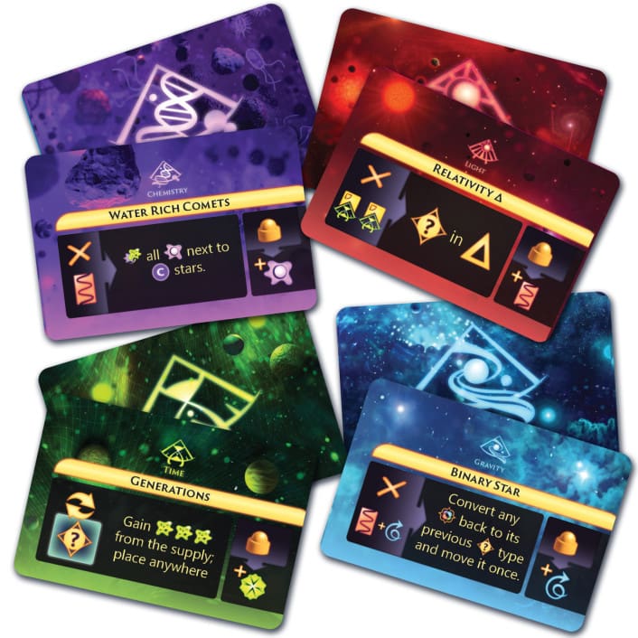 Use energy cards to gain powerful booster cards, enhancing your ability to craft and control your universe more efficiently. Strategically position stars around nebulae to score maximum points, balancing resource placement with game objectives. Use graviton cards to shift stars and life, creating an optimal galaxy layout and completing entropic goals.