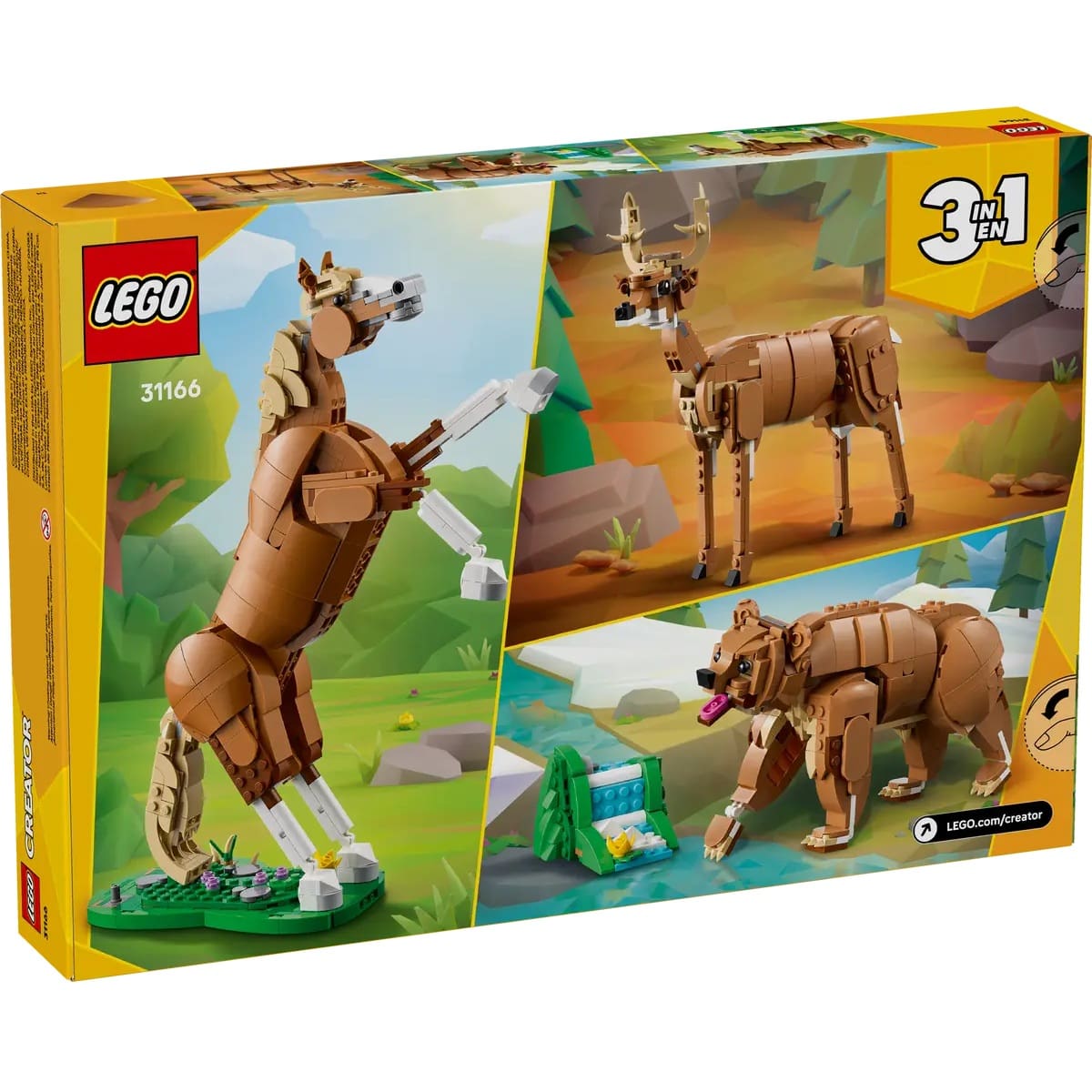This multi-model LEGO® set provides three exciting building options: a highly posable horse, a charming bear with a miniature waterfall, and an elegant deer. Kids can enjoy mixing, matching, and reconfiguring these models for endless fun—though only one model can be built at a time.