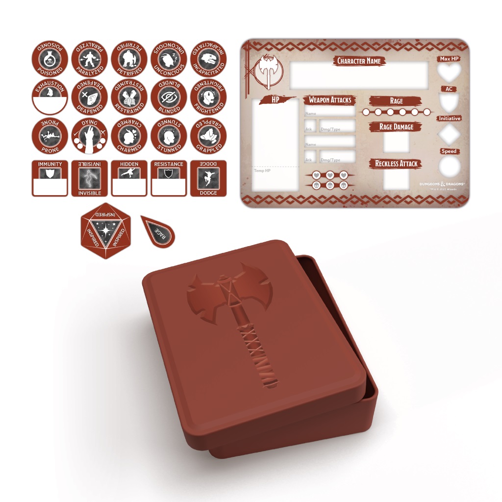 This token set contains a player board and 23 tokens, and is designed to allow you to easily and quickly track your character’s status effects. If your character is frightened, paralyzed or unconscious, your allies will be able to see at a glance that you are in need of help. Because all of our full-color tokens are made of durable perspex they are wet-erasable, so you can write additional information straight onto them. The combat tile provides a place for you to keep a running total of constantly changing statistics like character health and resources, all without dirtying your character sheet with eraser marks. Presented in a unique class tin, with space to add your character’s name.