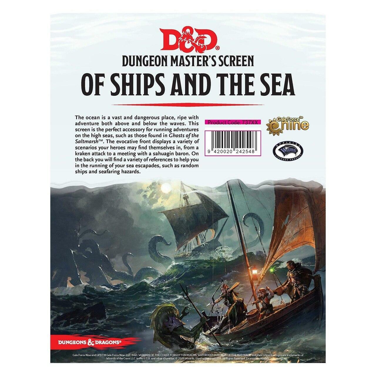 The ocean is a vast and dangerous place, ripe with adventure both above and below the waves. This screen is the perfect accessory for running adventures on the high seas, such as those found in Ghosts of the Saltmarsh. The evocative front displays a variety of scenarios your heroes may find themselves in, from a kraken attack to a meeting with a sahuagin baron. On the back you will find a variety of references to help you in the running of your sea escapades, such as random ships and seafaring hazards.