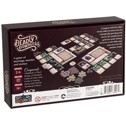 Deadly Dowagers is a game of marriage, murder, and money. You compete with the other lovely ladies in your town by strategically growing your dowry, while being careful not to gain too much infamy, or the duke may pass you over for another bride!