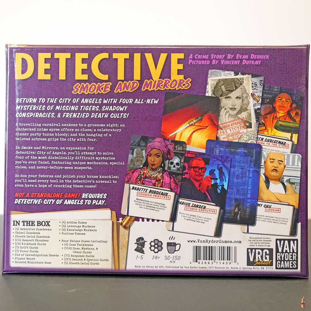 This is an all new expansion for Detective: City of Angels. Smoke and Mirrors adds the hardest cases our intrepid Detectives have had to solve so far. Do you have what it takes to see through the Smoke and Mirrors?