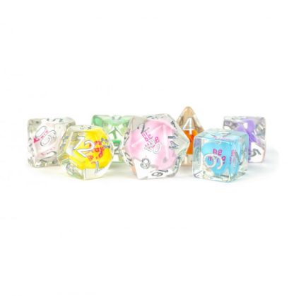 MDG resin dice have unique inclusions that add flare to any gaming table. These are full-sized 16mm polyhedral dice sets that come with 7 dice (d4, d6, d8, d10, d10%(00-90), d12, and d20).