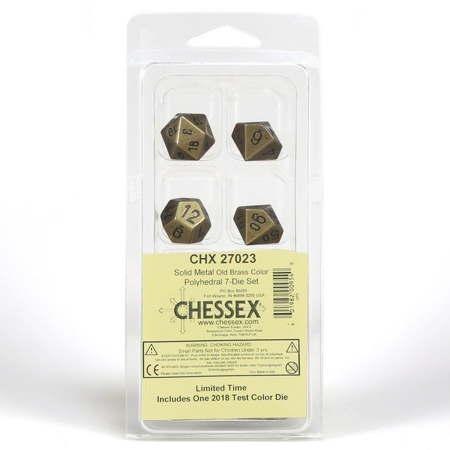 7-die polyhedral metal set, including one each of the following: D4, D6, D8, D10, D12, D20, and D10 percentile. Colors may vary from set to set. This set includes a random test die as a bonus.