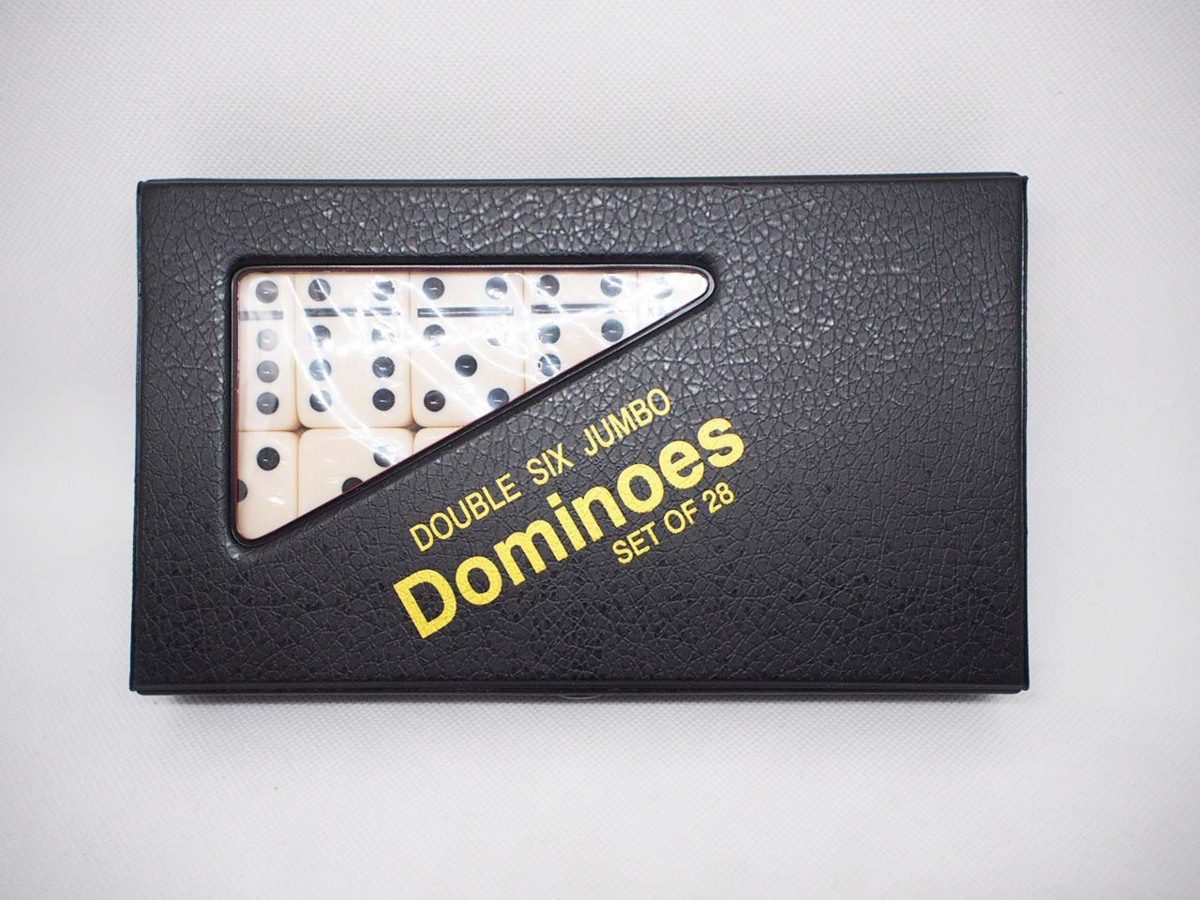 Double 6 jumbo size ivory color dominoes in vinyl case.