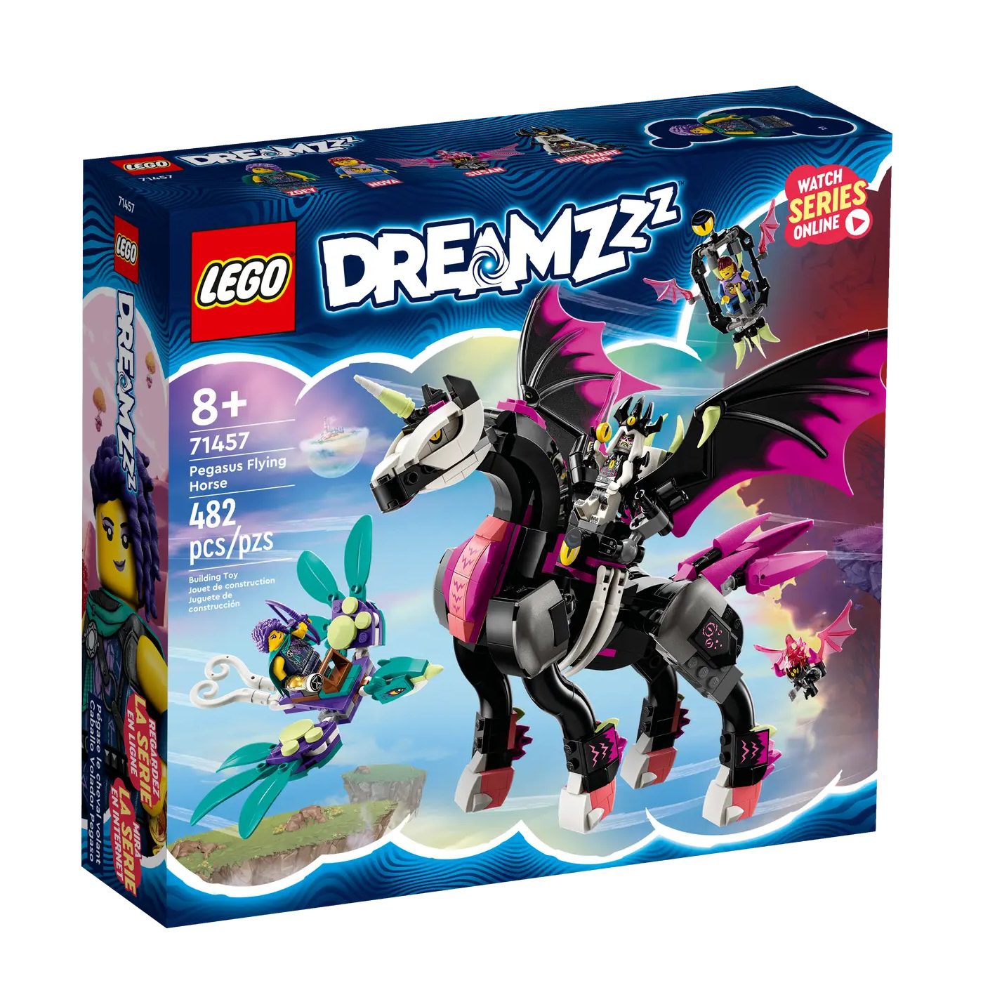 Let kids aged 8+ fly into the action of the dream world with this LEGO® DREAMZzz™ Pegasus Flying Horse (71457) building toy set. Based on the TV show, the set follows Zoey as she rescues her friend Nova, who’s been captured by nightmare creature Susan on the pegasus flying horse! Story-led building instructions let kids immerse themselves in the action and unleash their imaginations by deciding Zoey’s path.