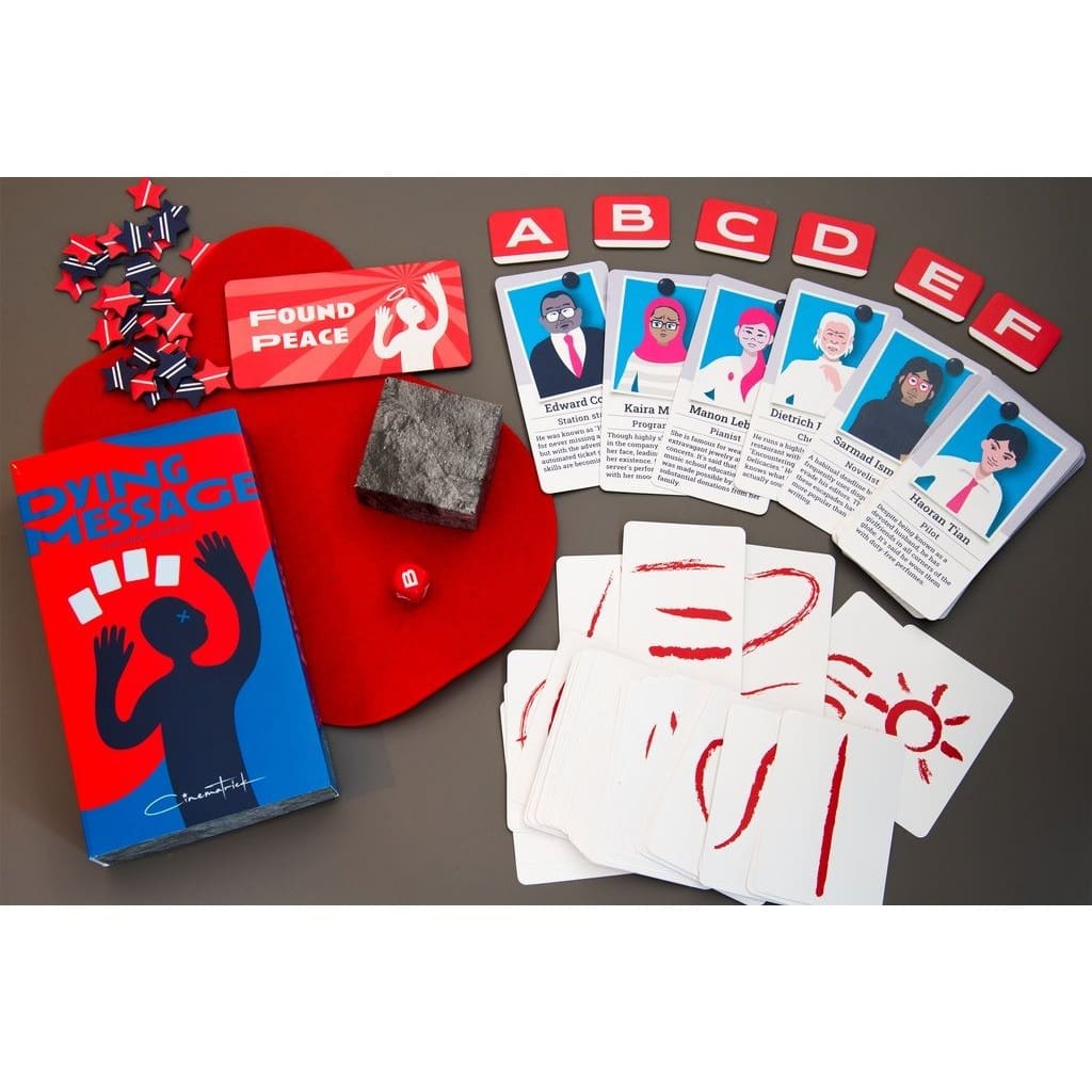 A murder has taken place—and the victim is you. In your final moments, you must reveal the identity of your killer using only a handful of unusual cards and whatever expressive power your fading body can muster. Your clue must be clever, evocative, and just ambiguous enough. If everyone solves it, you earn nothing. If no one can decipher it… also nothing. The ideal dying message lies in the tension between clarity and mystery.