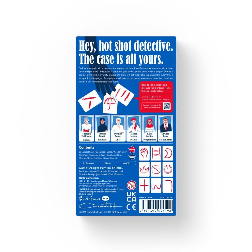 Players take on the roles of either the victim creating the final cryptic clue or the detectives racing to interpret it. Every round becomes a mind-bending puzzle of symbolism, deduction, bluffing, and creative communication. Inspired by classic mystery fiction and crafted with the signature minimalist ingenuity of Oink Games, Dying Message offers an experience full of tension, surprises, and unforgettable “aha!” moments.