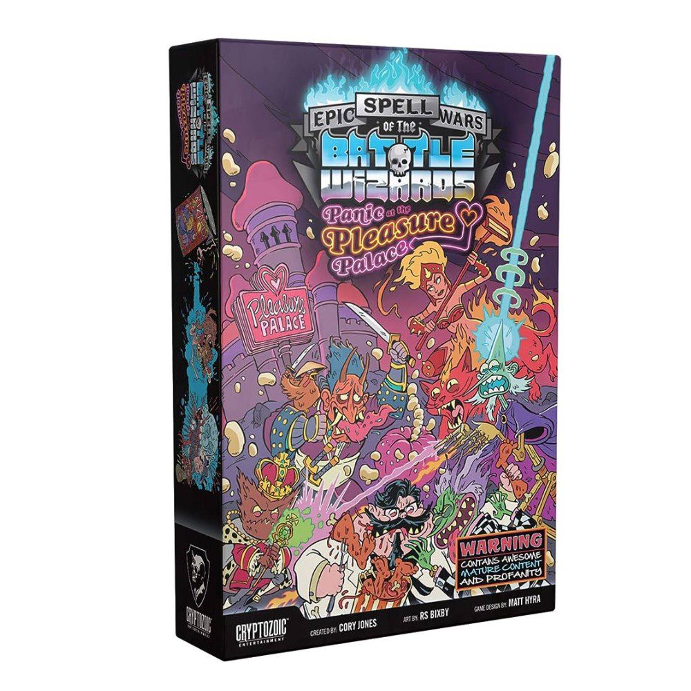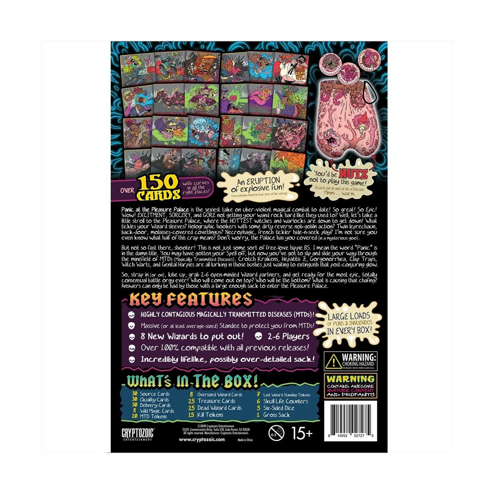 Epic Spell Wars of the Battle Wizards: Panic at the Pleasure Palace, the fourth game in the Epic Spell Wars series, takes the trademark humor-filled, mature gameplay and artwork to a new level for 2-6 players. Magically transmitted diseases (MTDs) are a powerful addition to the proceedings, leading wizards to suffer Crotch Krakens, Genital Harpies, and Gorgonorrhea, among other enchanted afflictions. MTDs also give players glyphs that lead to spells that are more epic than ever. In addition, players vie for control of the standee, which protects them from the MTDs that might come their way.
