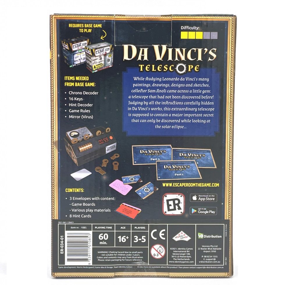 While studying Leonardo Da Vinci’s many paintings, drawings, sketches and notes, collector Sam Anoli came across a gem; a totally unknown telescope! Judging by all the well-hidden clues in Da Vinci’s works, this special telescope must contain a great important secret that can only be discovered while watching the solar eclipse…