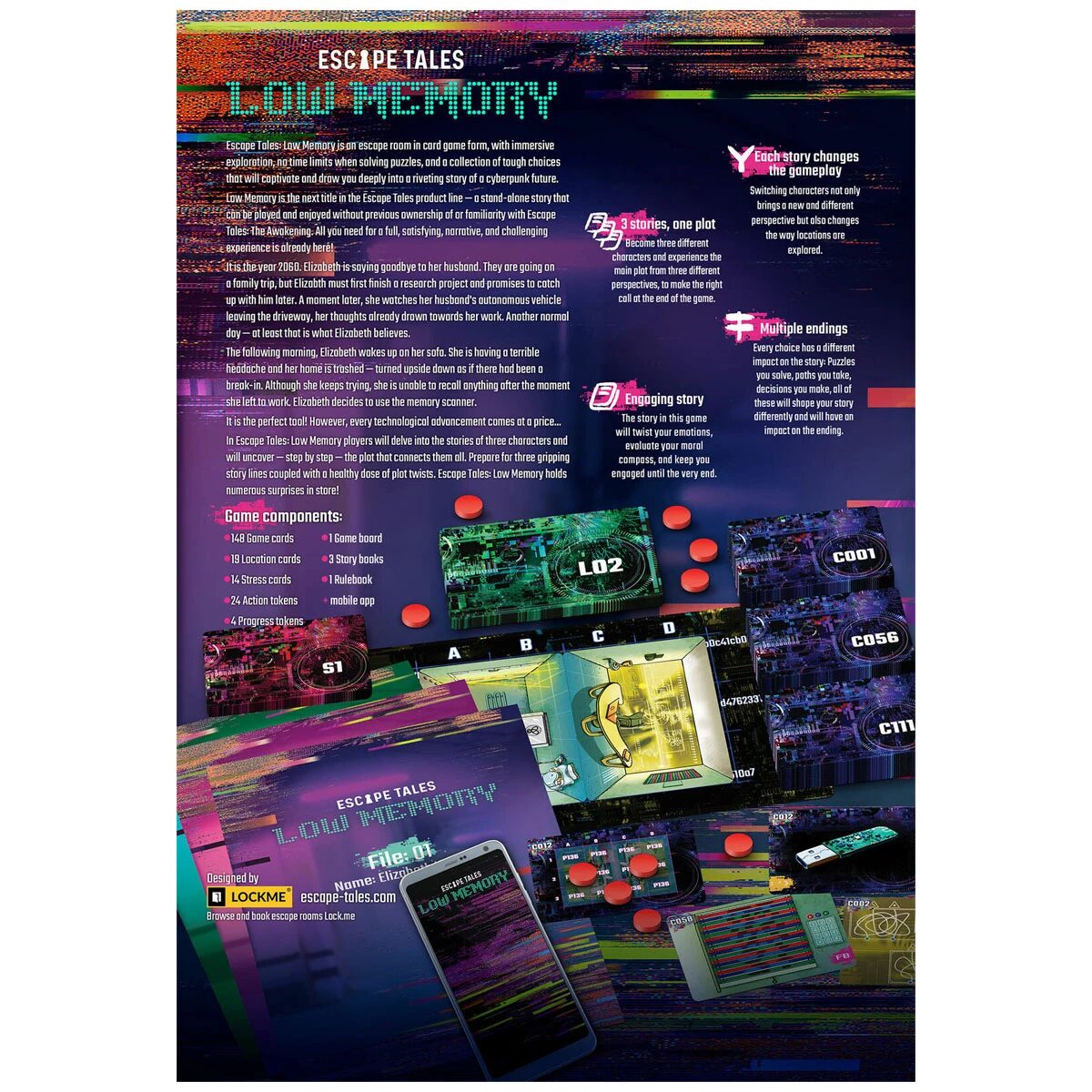 Escape Tales: Low Memory is an escape room in card game form, with immersive exploration, no time limits when solving puzzles, and a collection of tough choices that will captivate and draw you deeply into a riveting story of a cyberpunk future. Low Memory is the next title in the Escape Tales product line — a standalone story that can be played and enjoyed without previous ownership of or familiarity with Escape Tales: The Awakening. All you need for a full, satisfying, narrative, and challenging experience is already here!