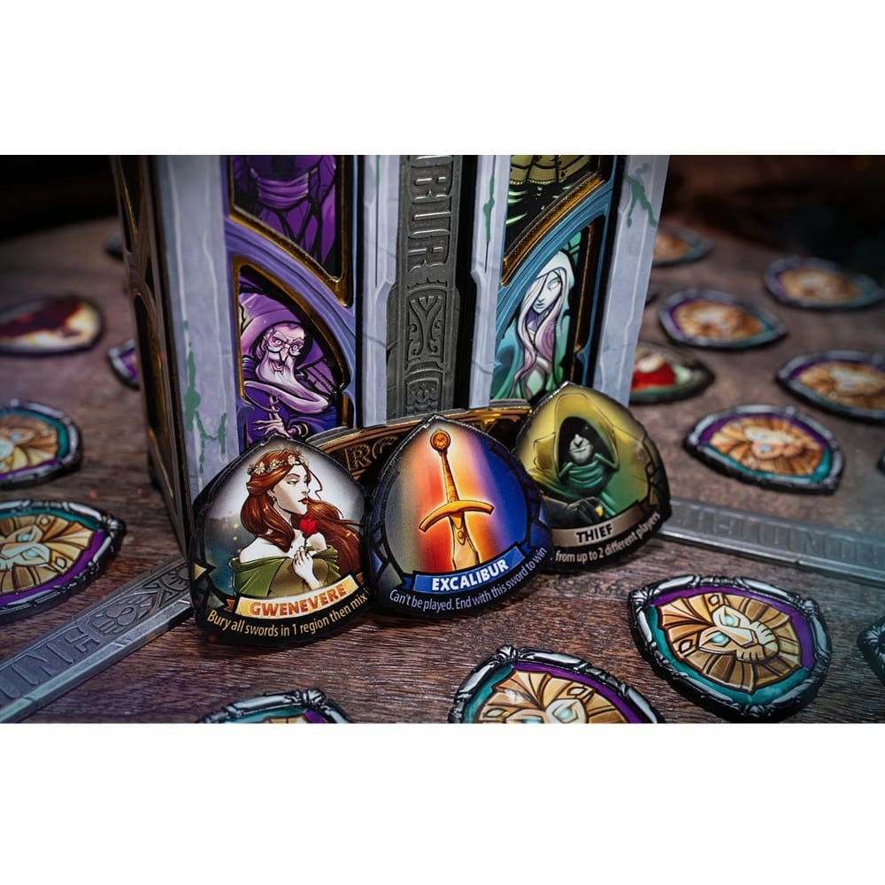 During each round, players simultaneously draw chips from the 3 regions of Avalon on the table and then reveal them one by one, resolving their effects and discarding them. The game ends when a region of Avalon has no more chips. A player must hold the Excalibur chip to win, otherwise everyone loses.