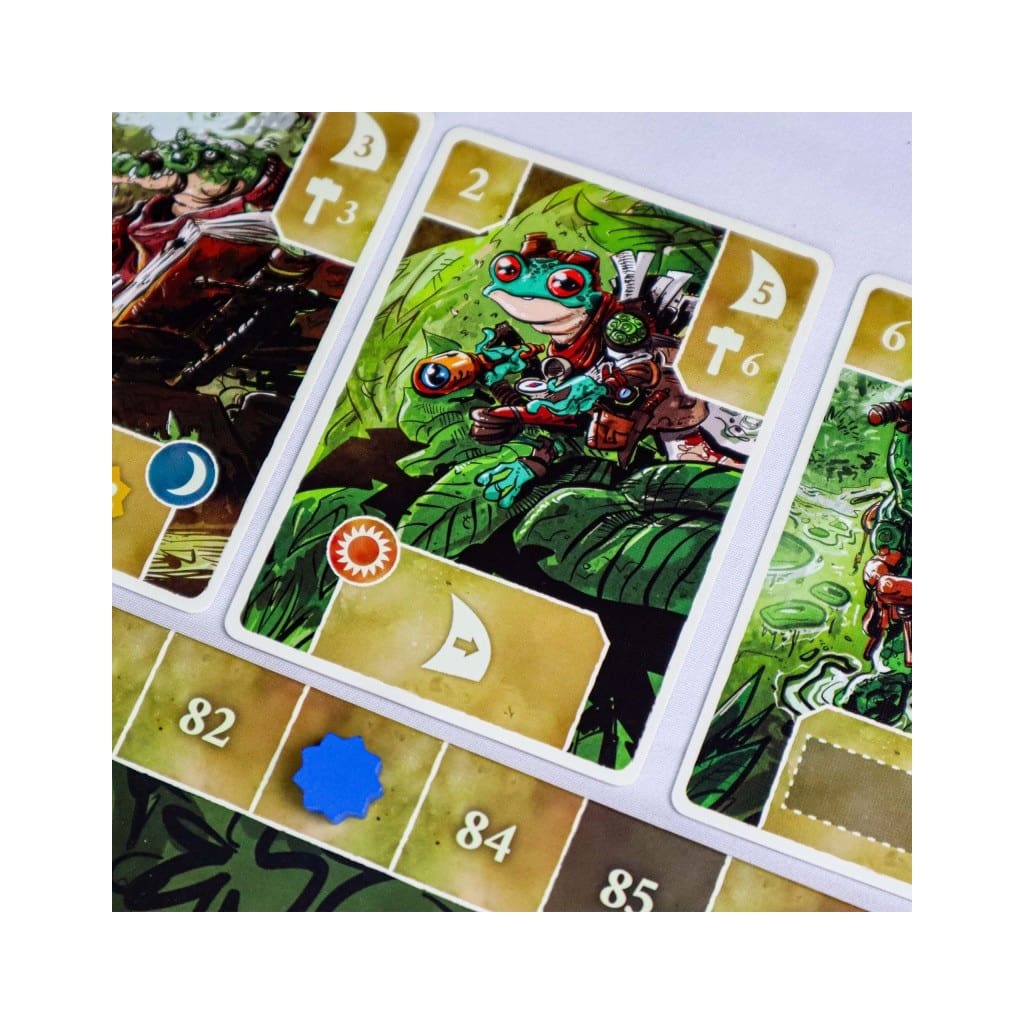 The game unfolds over four rounds, each divided into three phases: Income, Turn, and Maintenance. During the Turn phase, use your unique clan characters to strategically place workers and move your boats across the swamp. Each action — fishing, trading, exploring temples, or building settlements — brings you closer to victory.