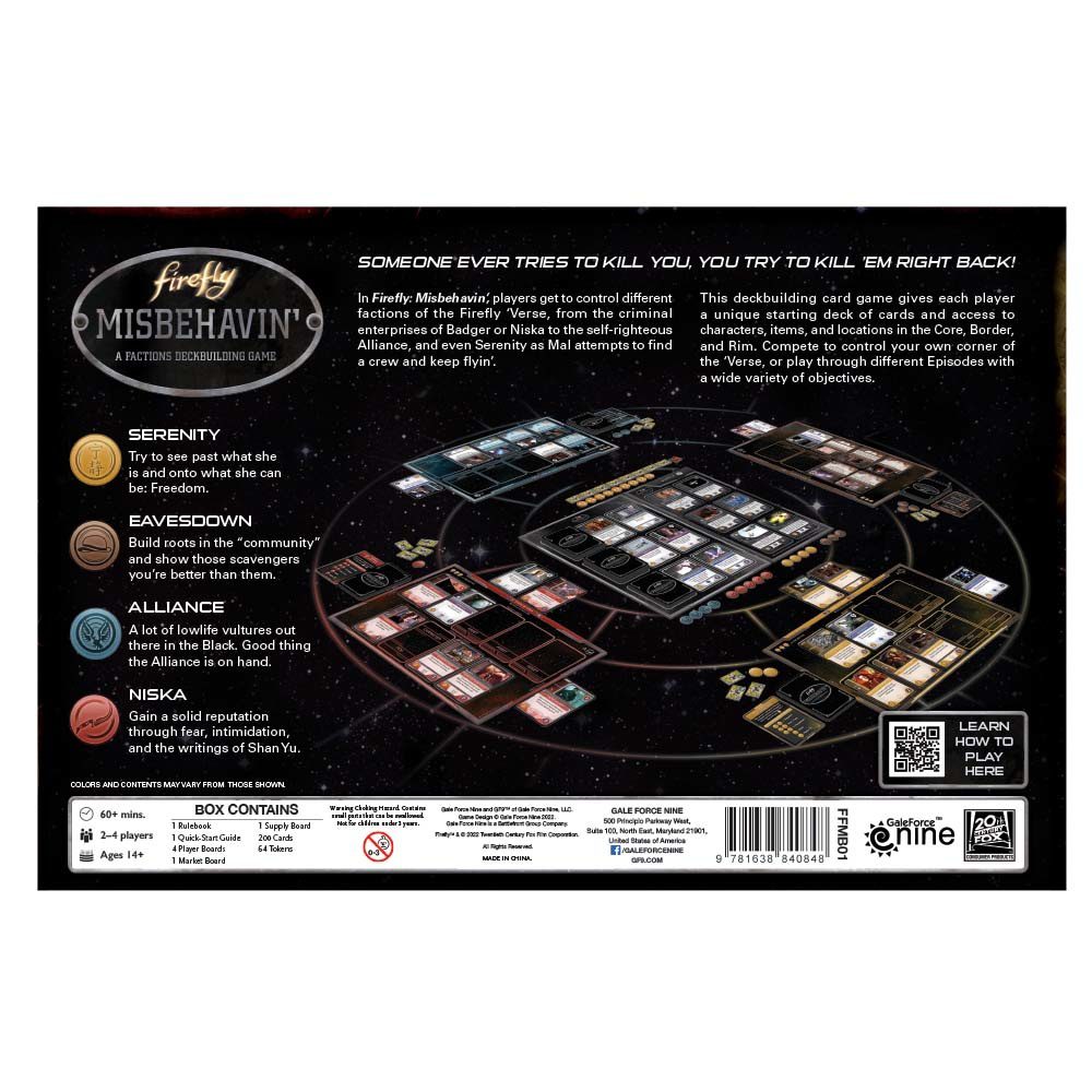 In Firefly: Misbehavin’, players get to control different factions of the Firefly ‘Verse, from the criminal enterprises of Badger or Niska, to the self-righteous Alliance, and even Serenity as Mal attempts to find a crew and keep flyin’.