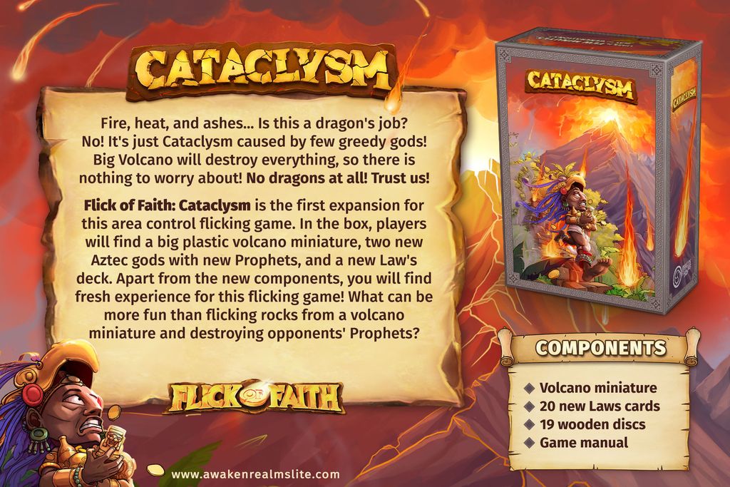 This Expansion adds a new mechanisms – Cataclysms and Shamans, 5th player mode as well as brand new gods and Law cards you can mix with the core box!