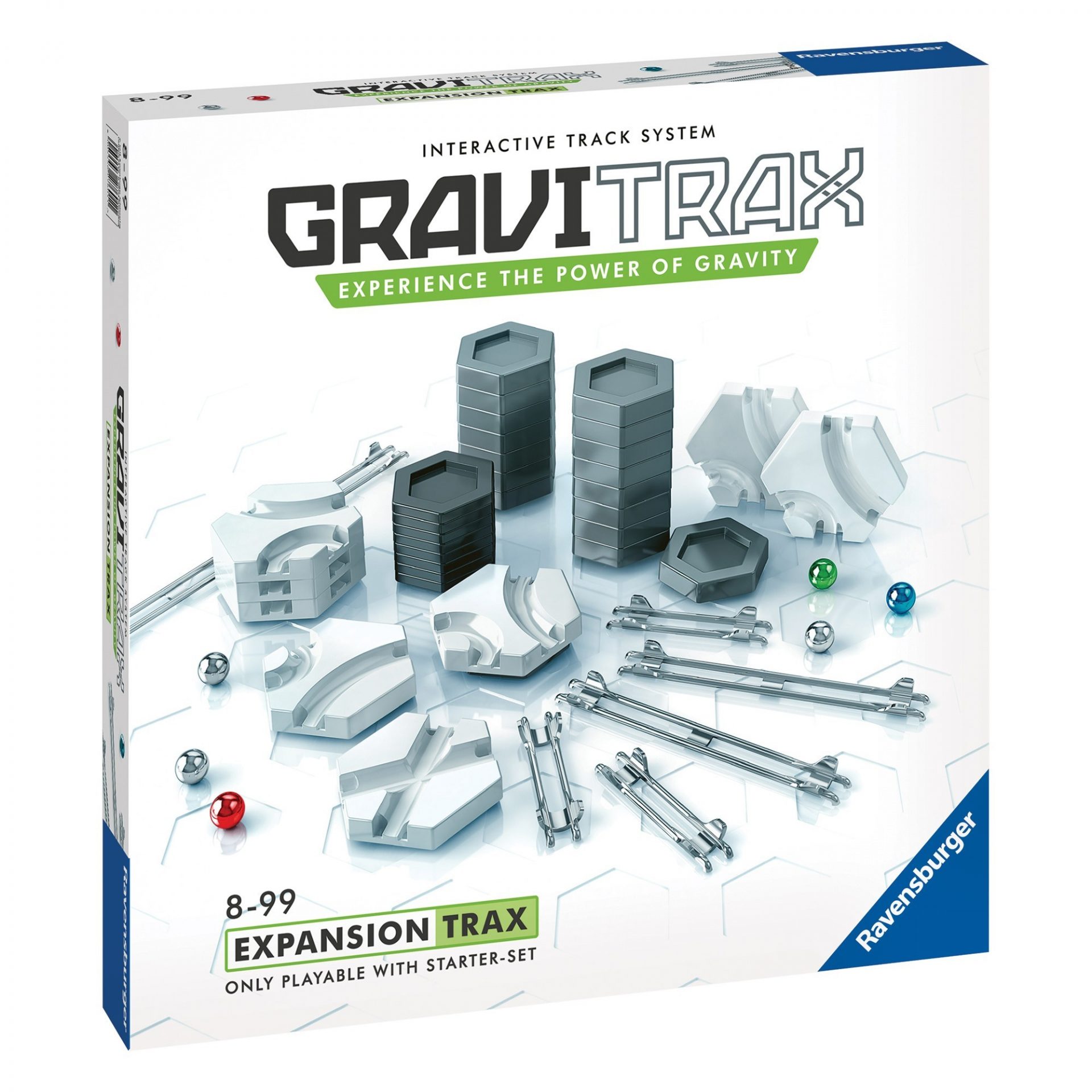 Keep the fun rolling and add some height, distance and curves to your marvelous marble run with the “GraviTrax Trax Expansion” set! Designed with open play in mind, GraviTrax offers endless possibilities to design a different track every time you play. This “Trax Expansion” set adds over 40 components (tracks, height tiles, curves, intersection, marbles) to any “GraviTrax Starter-Set” to take your building skills to a whole new level! Experience the power of gravity and educational fun today!