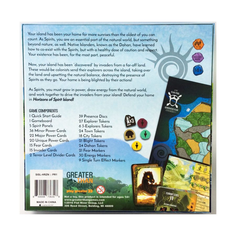 Horizons of Spirit Island features the core mechanisms of Spirit Island, but features a new double-sided game board with a streamlined set-up, punchboard components, and five new Spirits designed to be ideal for those playing a Spirit Island game for the first time. These new Spirits are compatible with all existing Spirit Island components, but to play with expansions like Jagged Earth, you would need a copy of Spirit Island itself.