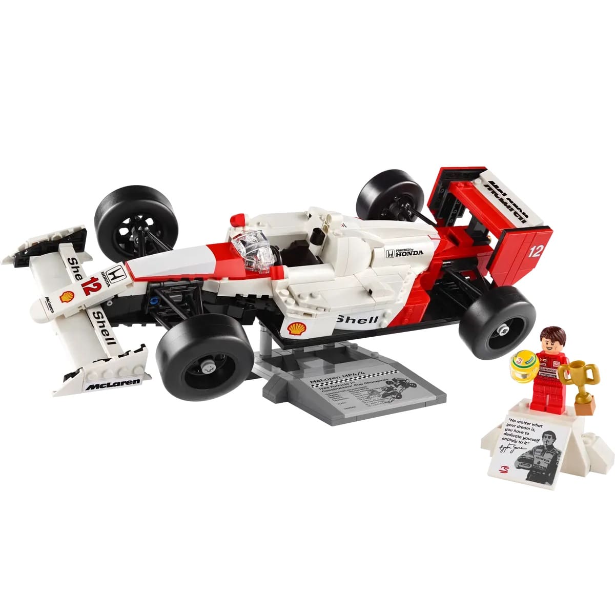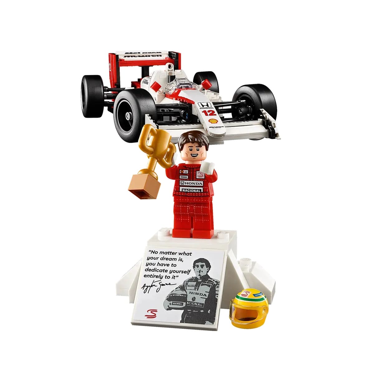 - Desk decor for the home and office – Includes a McLaren MP4/4 display stand with printed vehicle statistics and an Ayrton Senna minifigure display podium with a photo and iconic Senna quote