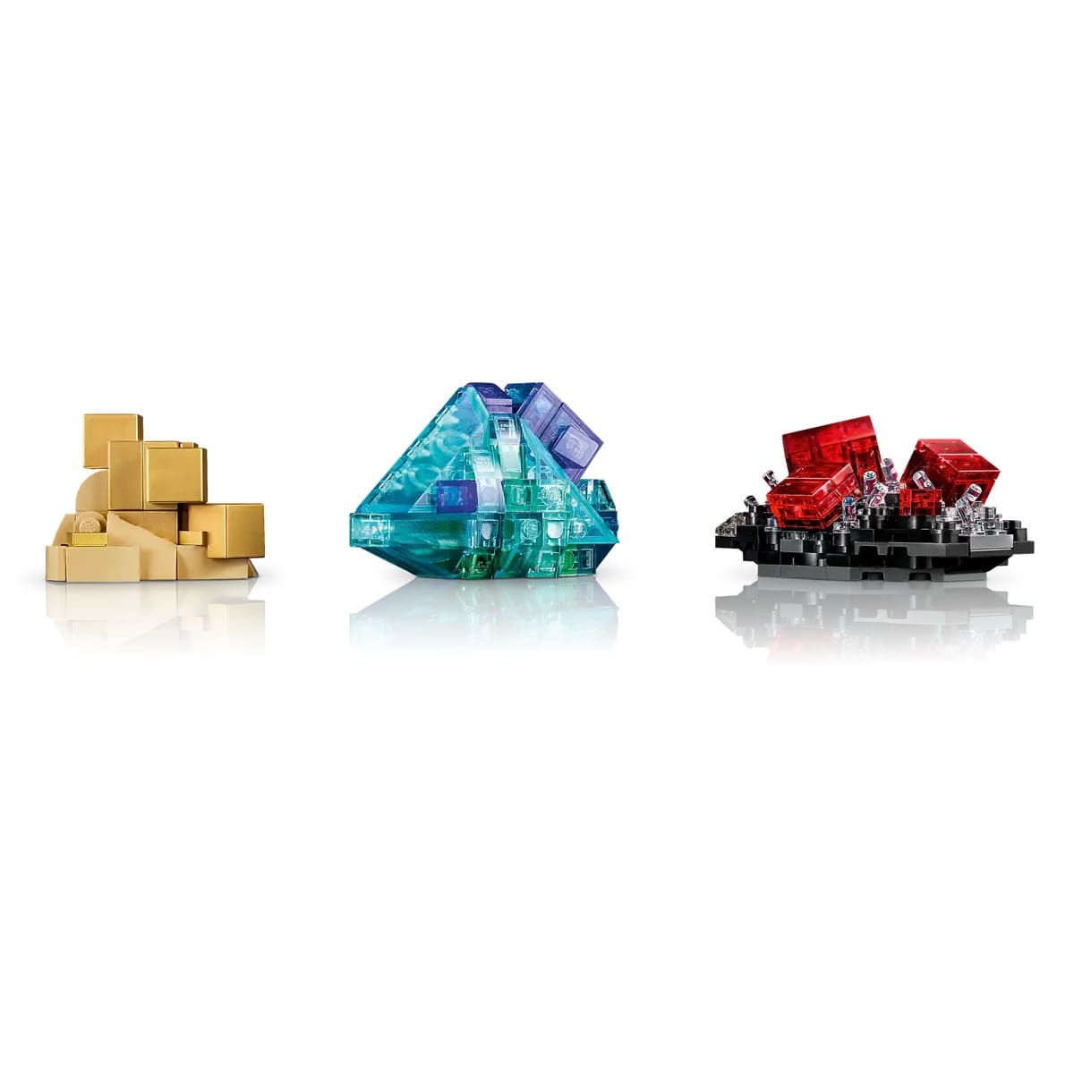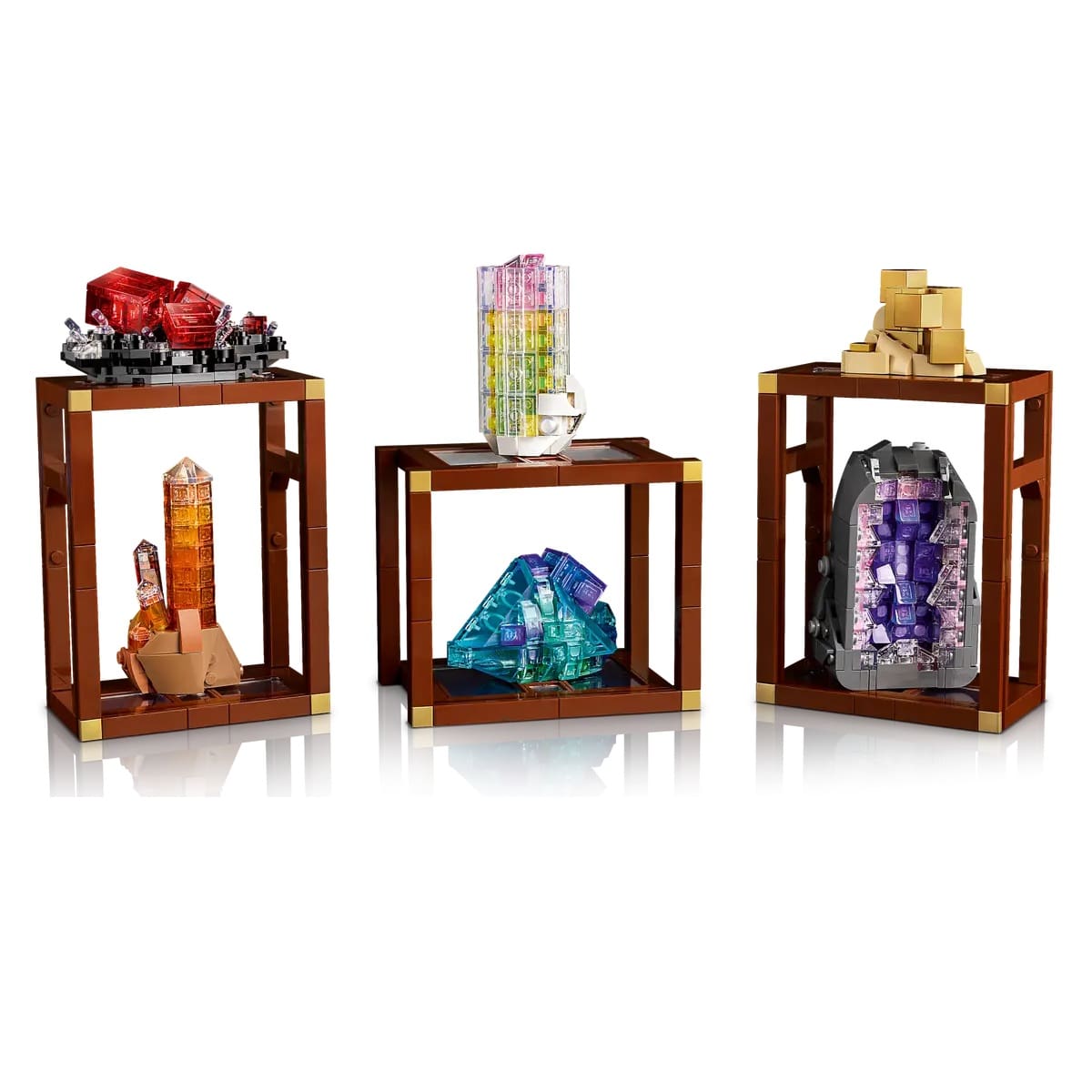 - Transparent brick techniques: use of clear and tinted elements captures light and sparkle, giving each specimen a convincing gem‑like presence without needing adhesives or extra lighting.