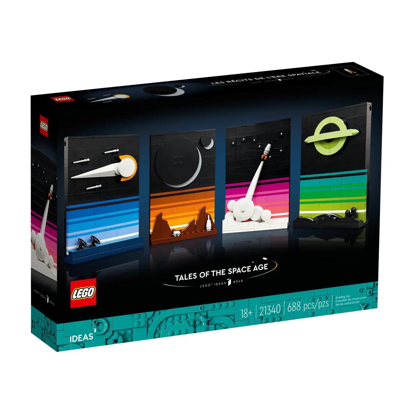 - 4 connectable, space-themed 3D postcards (21340) – Tell Tales of the Space Age in LEGO® style with these buildable postcard models, inspired by 1980s sci-fi myths, films, books and posters