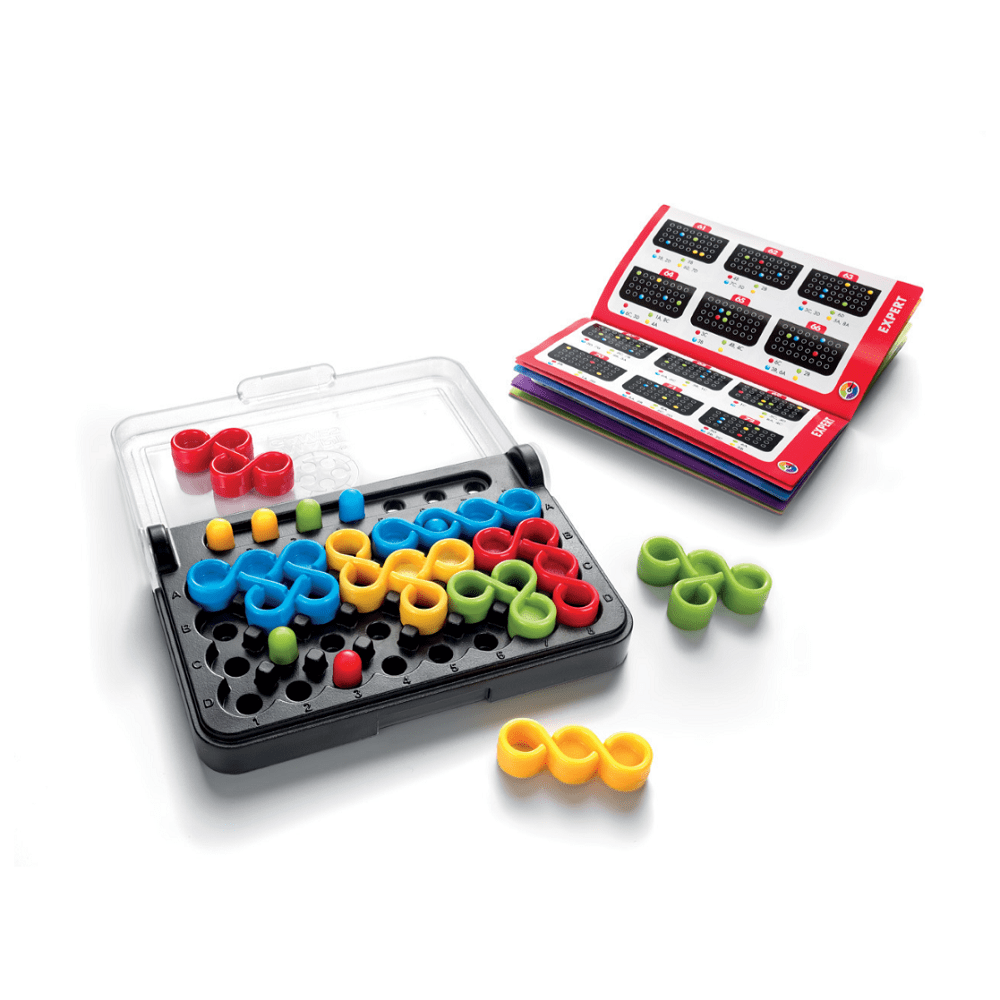 The game consists of 8 twisted puzzle pieces and 7 coloured pegs. To play, choose a challenge from the booklet. You’ll need to place the coloured pegs on the board to match the puzzle challenge. Then, your goal is to fit all the twisted puzzle pieces back into the board.
